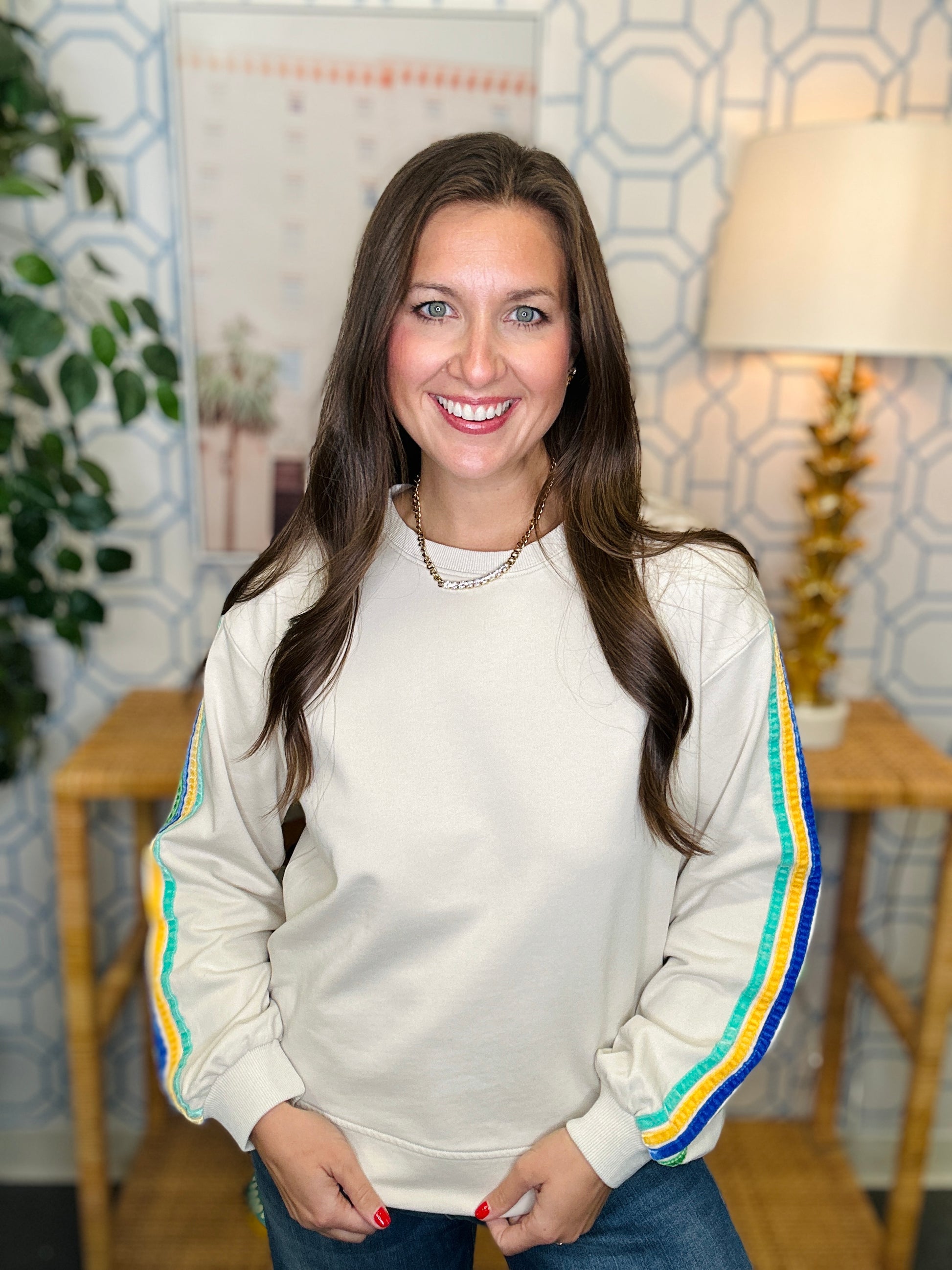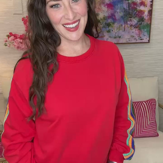 Turn heads in The Kelby Pullover, a vibrant red statement piece that's anything but basic. Soft and cozy, this pullover gets its wow factor from luxe velvet ribbon stripes running down the arms—a playful detail that transforms a simple sweater into something special. Perfect for adding a pop of color and texture to your everyday rotation, it's the kind of piece that makes you smile every time you put it on. Bold, fun, and unapologetically you.