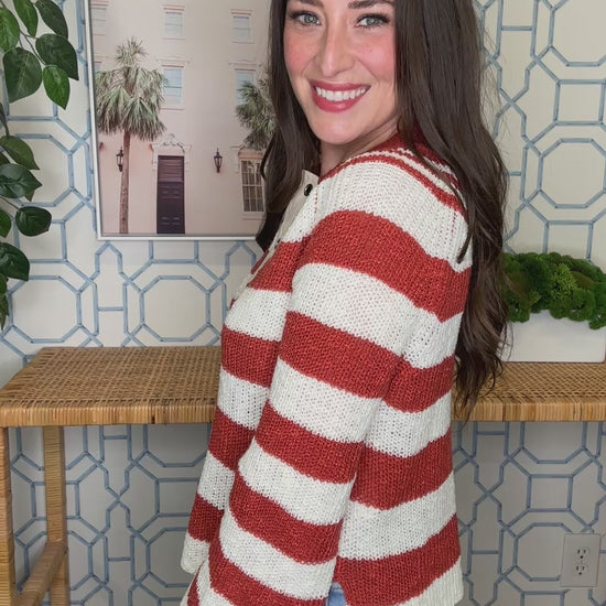 Stripes never go out of style, and this rust and white striped sweater proves it! Featuring three charming front buttons that add just the right amount of detail, this piece is ready to become your new favorite. Layer it, wear it solo, or button it up for that perfectly put-together vibe. Classic stripes with a fun twist—what's not to love?
