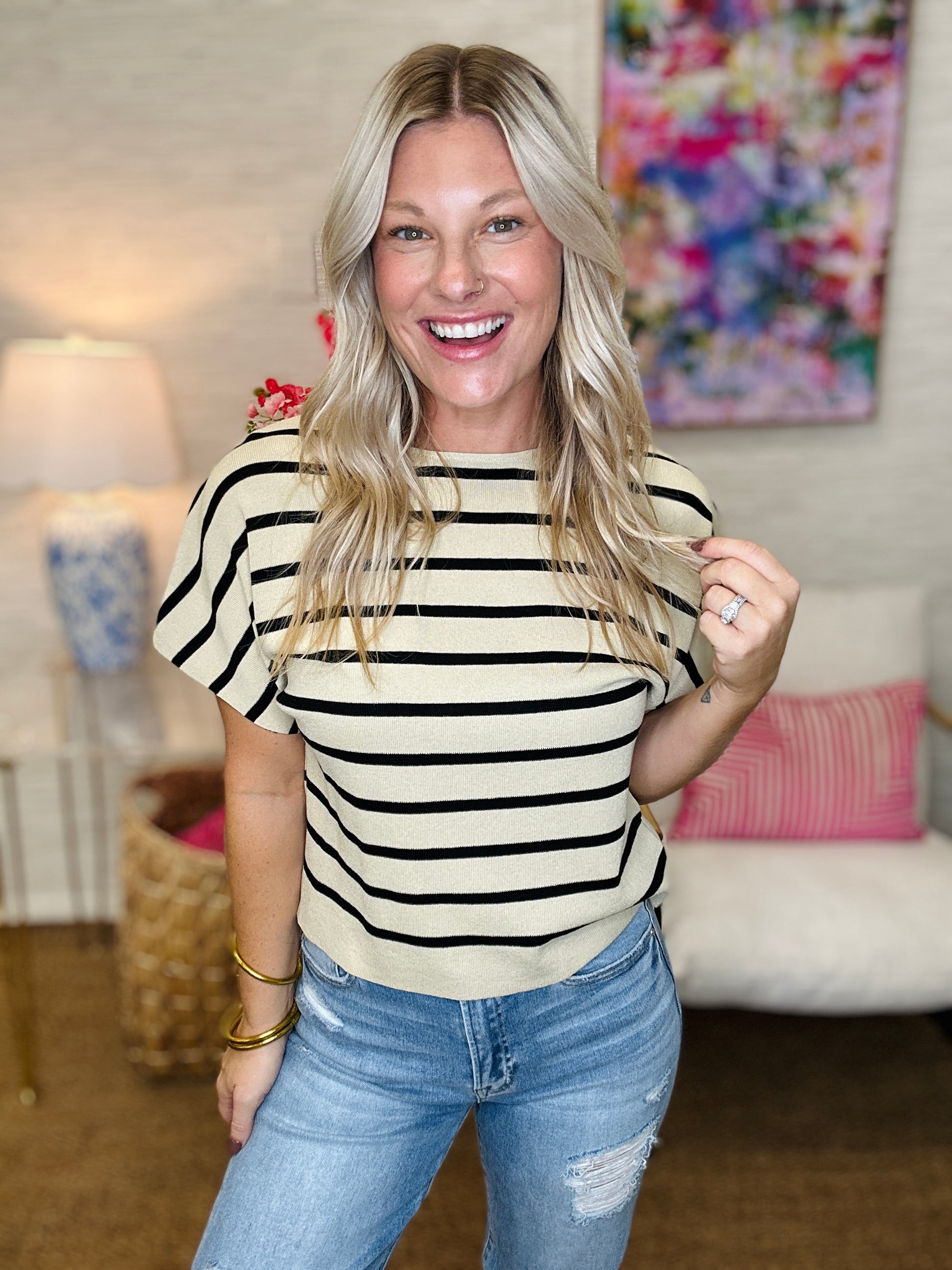 The KT Stripe Top brings playful energy with its cap sleeves and black and cream stripe pattern. Perfect for adding class and fun to any outfit, it’s an easygoing way to elevate your style.