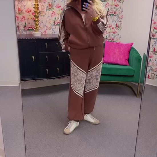 The Lace Mocha Set is pure adorableness wrapped up in one package. This charming zip-up set features delicate lace detailing that elevates your comfort game with a touch of elegance. Perfect for cozy nights in or casual outings, it's the kind of piece that makes you smile every time you wear it. Soft, stylish, and undeniably cute—this set is ready to become your go-to favorite.