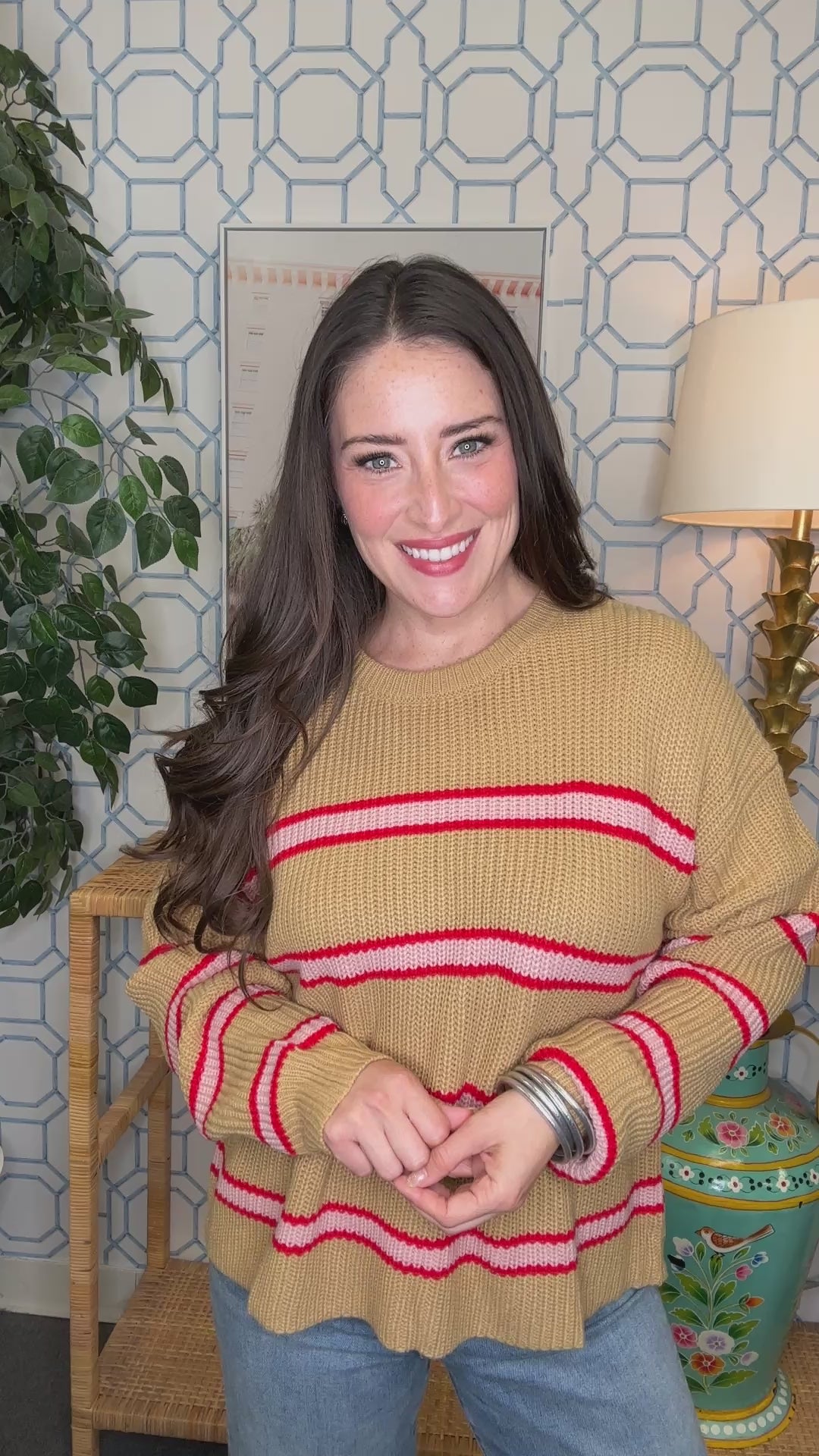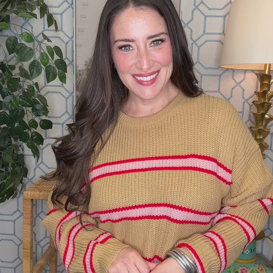 The Lancaster Sweater is your cozy companion with a pop of personality. This camel brown knit features a charming pink stripe detail outlined in red—a playful color combo that feels both retro and totally fresh. Soft, warm, and endlessly wearable, it's the kind of sweater that makes you want to curl up with your favorite beverage and good company. Layer it, tuck it, or wear it loose—this beauty works every which way.