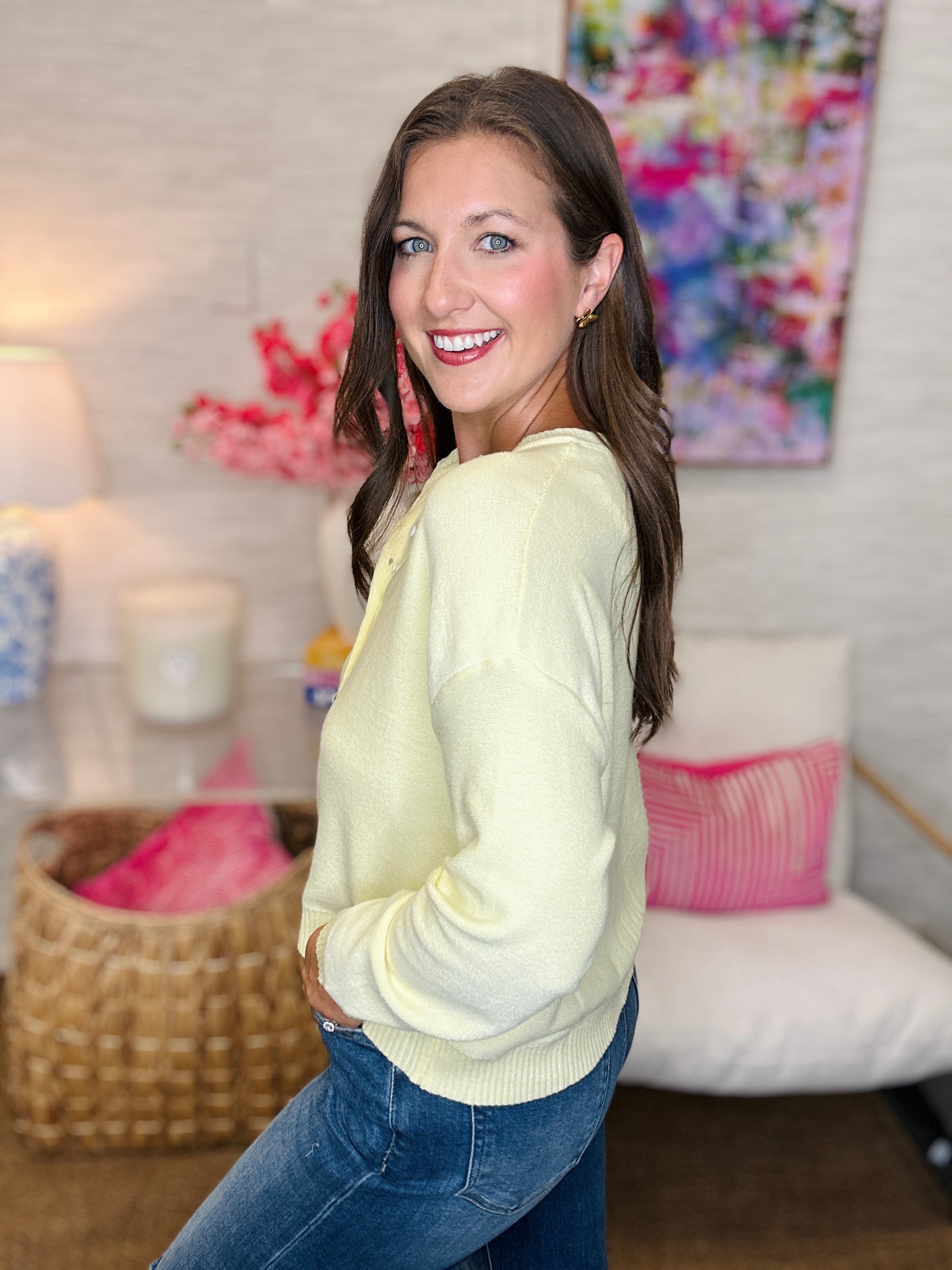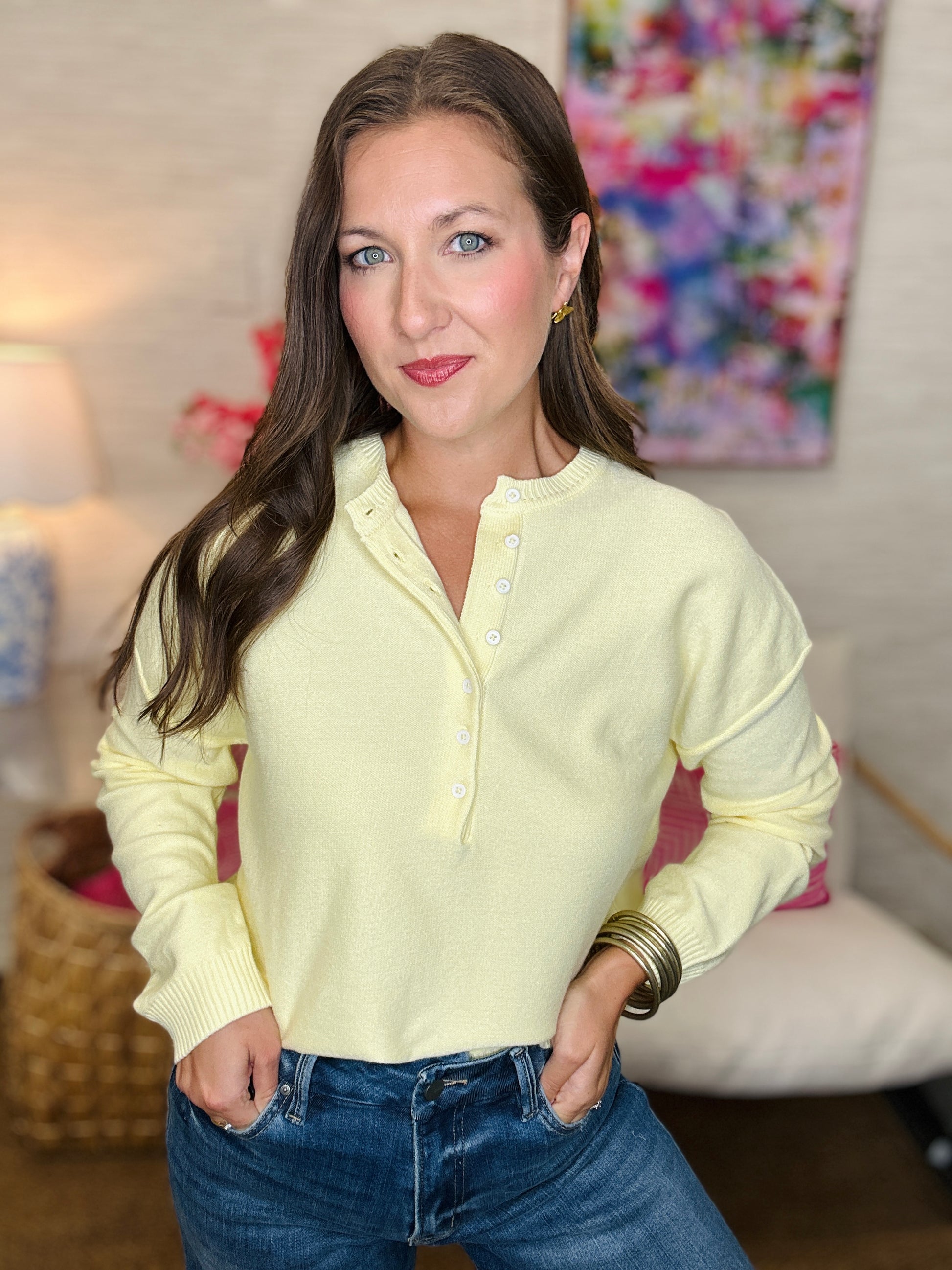 Meet The Lemon Henley, a cozy button-up sweater that’s as fun as it is functional. With real buttons you can play with, this playful piece adds a touch of charm and versatility to your everyday wardrobe—perfect for layering or wearing on its own for a bright, breezy look.