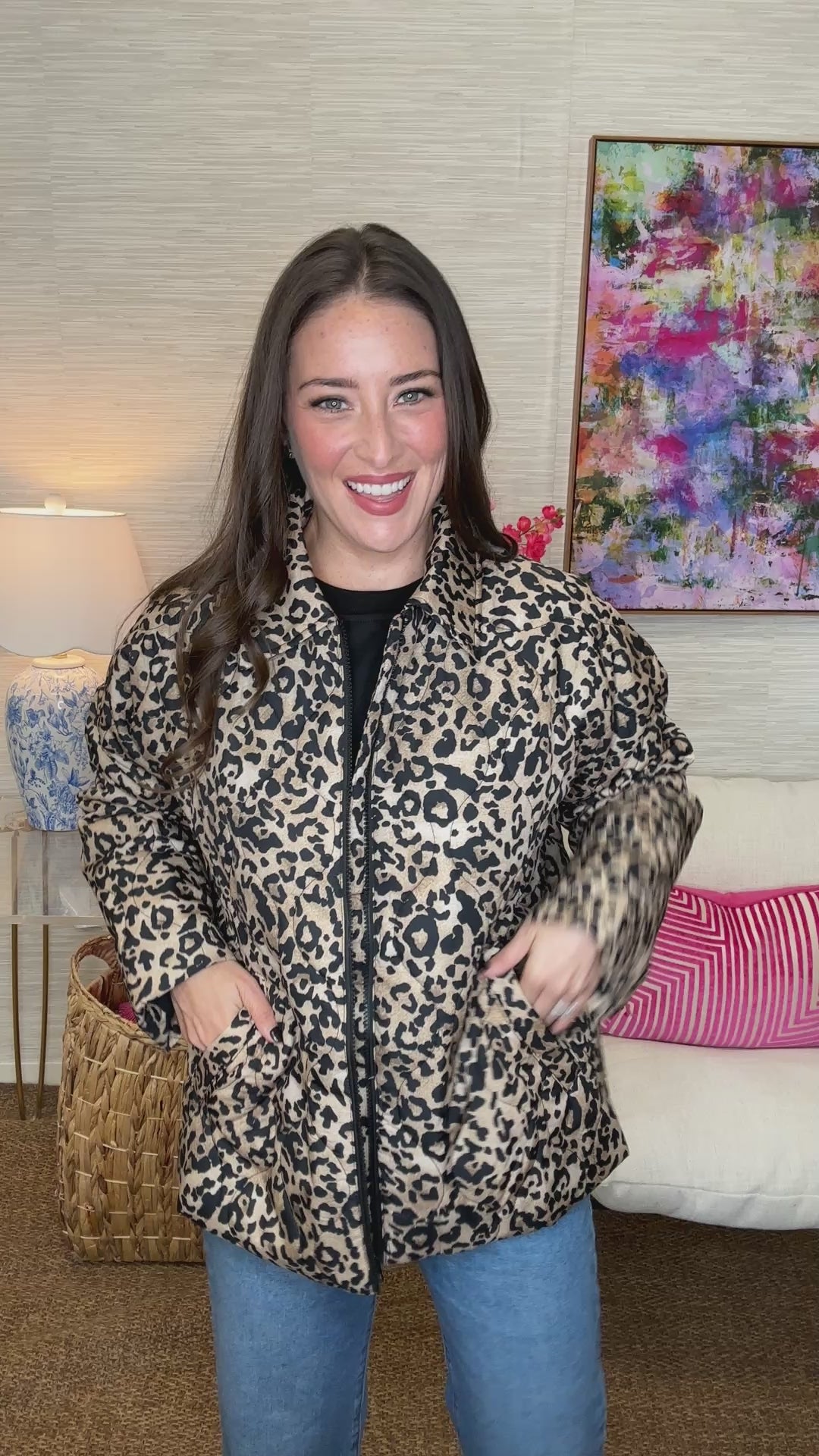 Turn up the fun with The Leo Quilted Jacket. This playful quilted jacket features a bold leopard print that brings fierce style and cozy warmth to your look, perfect for adding a wild touch to any outfit.