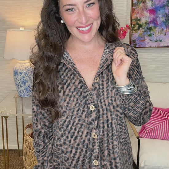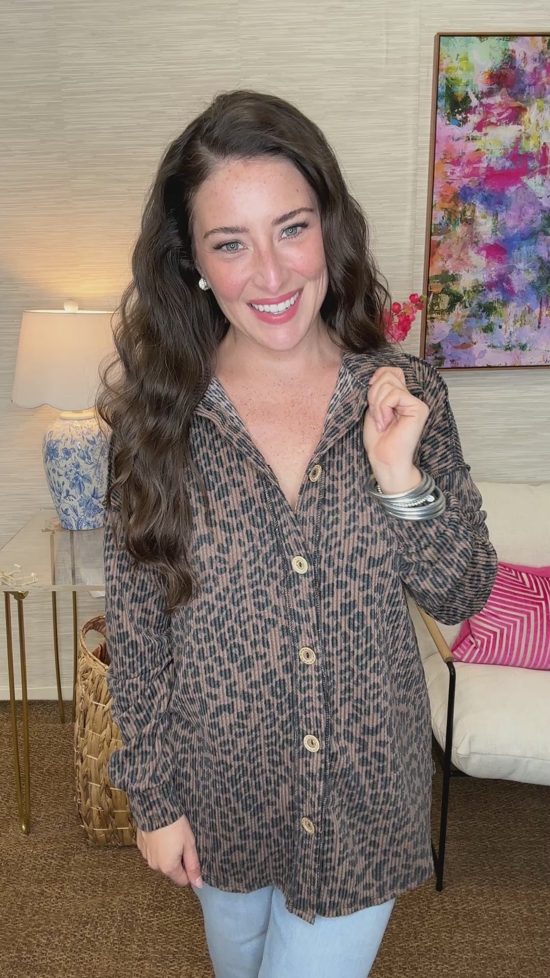 The Leo Shacket is your new layering obsession! This relaxed-fit button-up features a bold Leo print that roars with personality. The ribbed fabric adds structure and comfort, while the shacket silhouette works perfectly over tees, tanks, or dresses. Throw it on for instant edge and effortless cool. Whether you're running errands or heading out for the evening, this versatile piece proves that wild style never goes out of fashion!