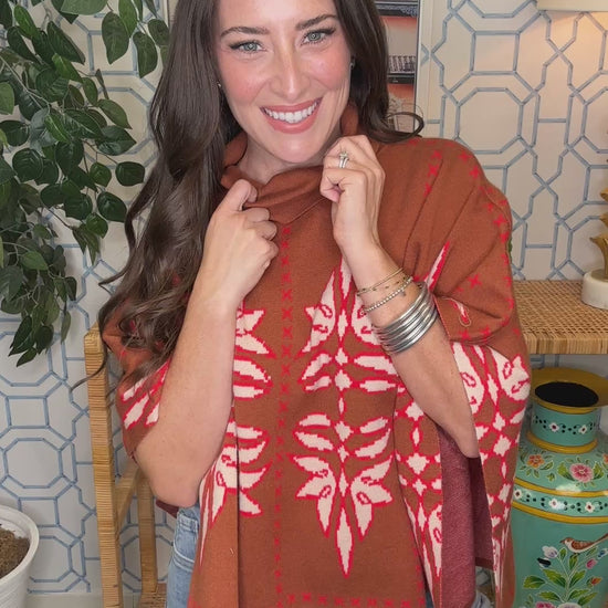 The Lexie Poncho brings warmth and whimsy to your seasonal wardrobe. This loose turtleneck poncho features a gorgeous gingerbread brown base with a cream design beautifully outlined in red-orange—a color combo that screams cozy autumn vibes. Slip it on for instant comfort and style that works whether you're layering over basics or making it the star of your outfit. Perfect for those moments when you want to feel wrapped in comfort without sacrificing an ounce of charm. Your new fall favorite awaits.