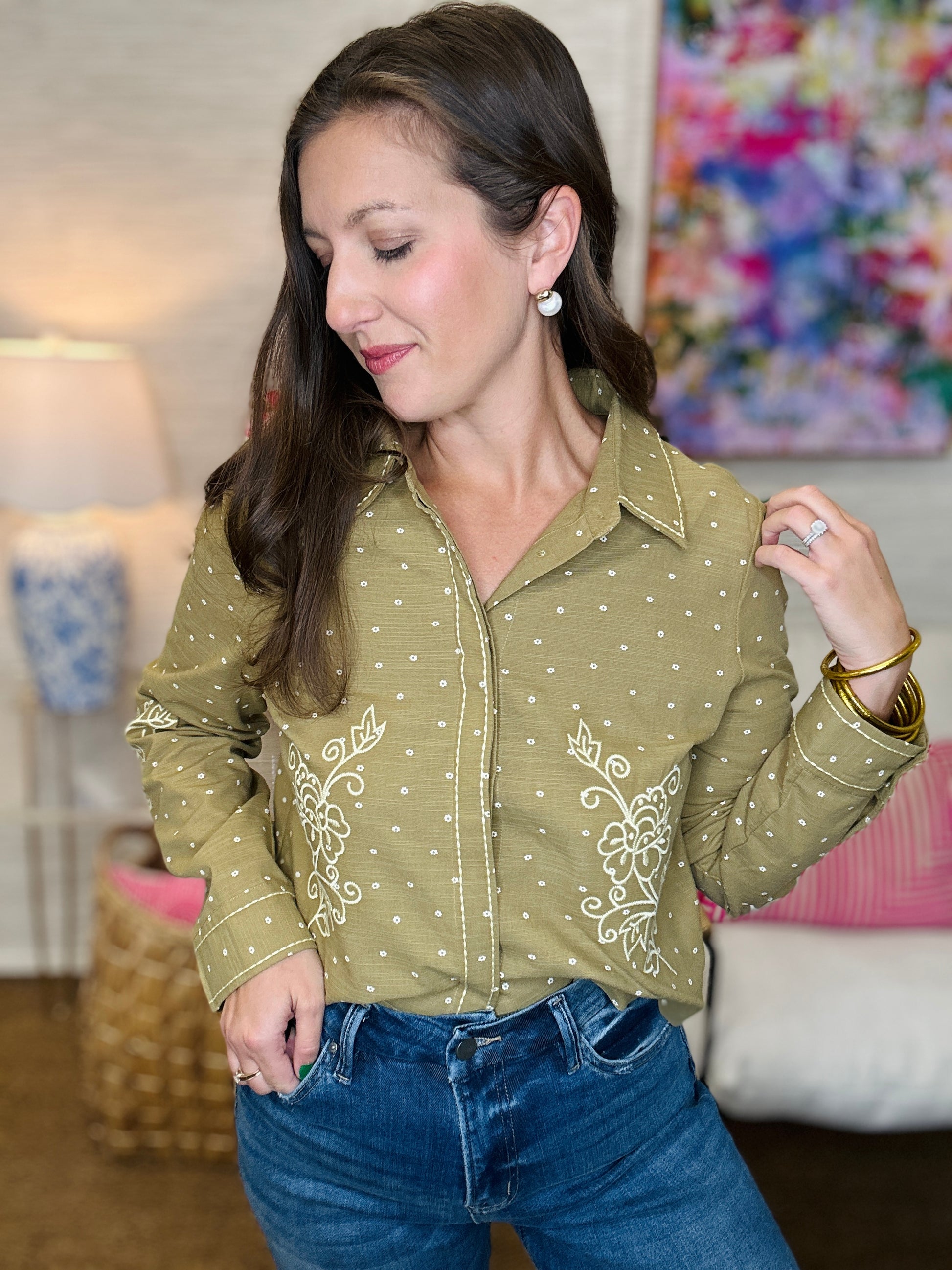 Saddle up style with The Lissa Top, an olive button-down that brings Western charm to your everyday look. This cropped long sleeve features beautiful embroidered details that add character and flair, giving you that effortless ranch-inspired vibe. Cozy, cute, and unapologetically fun—your new go-to for that laid-back Western aesthetic.
