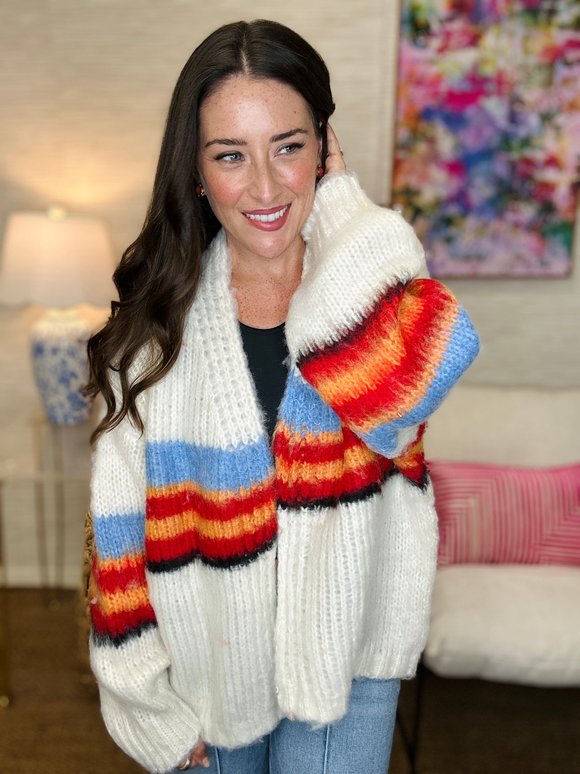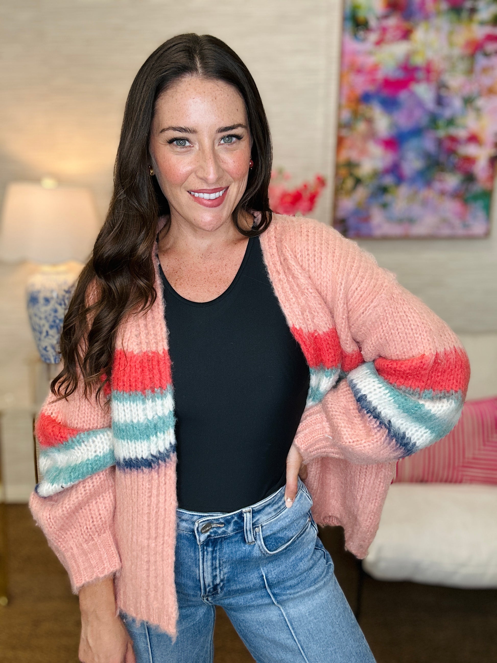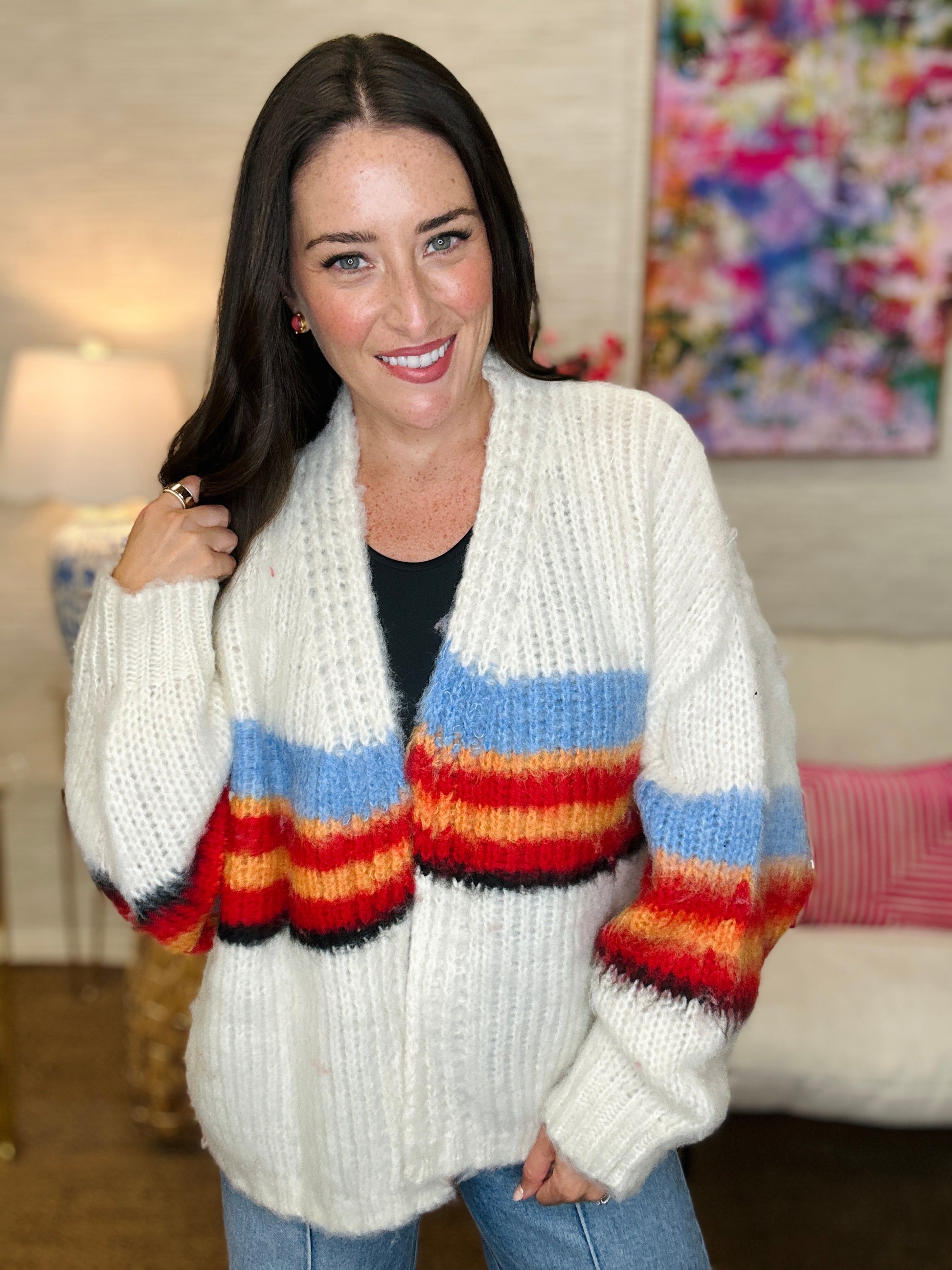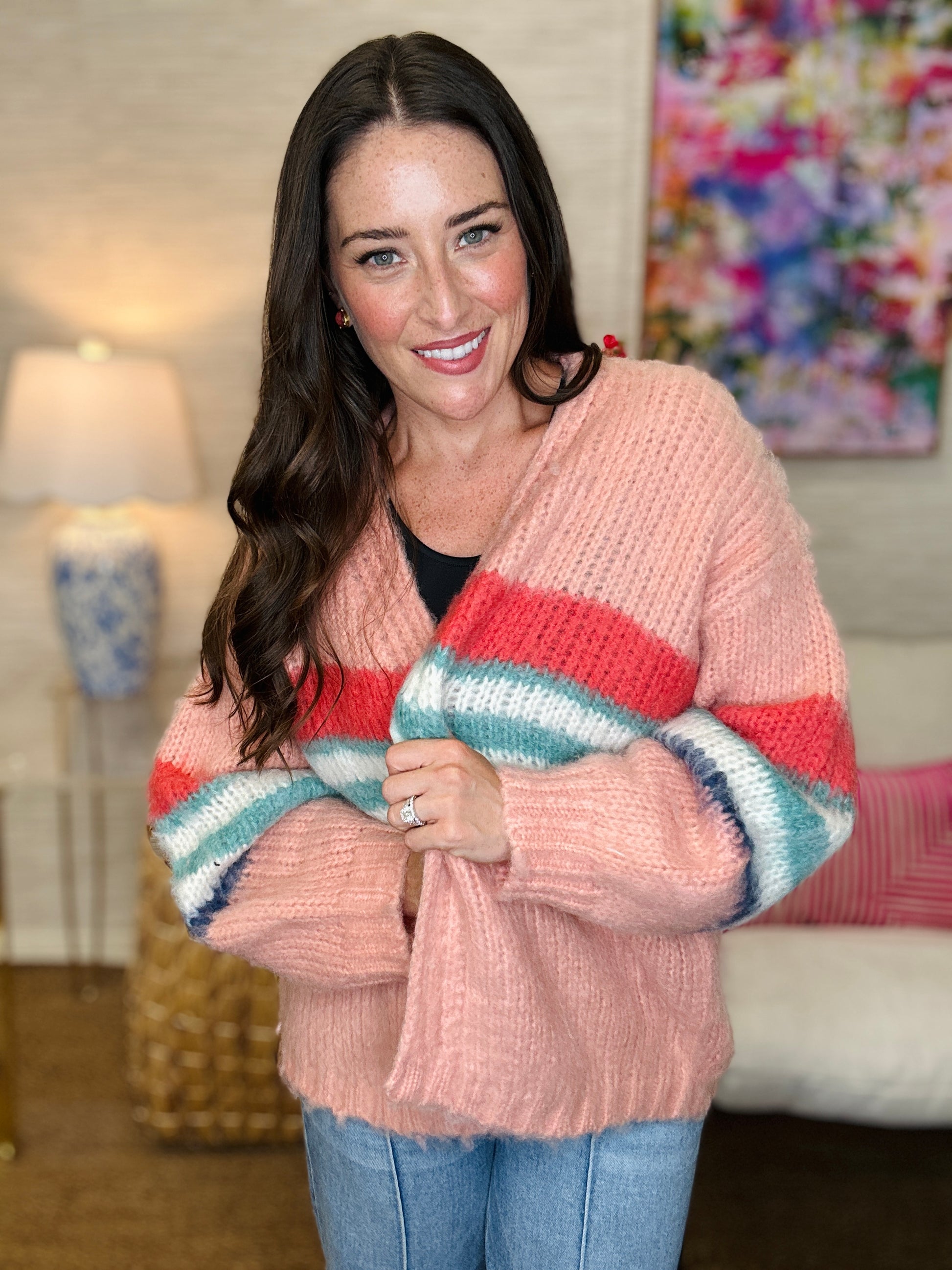 Cozy up in the Living Faithfully Cardigan, where playful balloon sleeves meet a relaxed fit for effortless style. Crafted from soft mohair with a charming pointed striped pattern, this cardigan adds a whimsical touch to any outfit while keeping you warm and comfy all day. Perfect for layering or lounging, it’s the easygoing piece your wardrobe’s been waiting for.