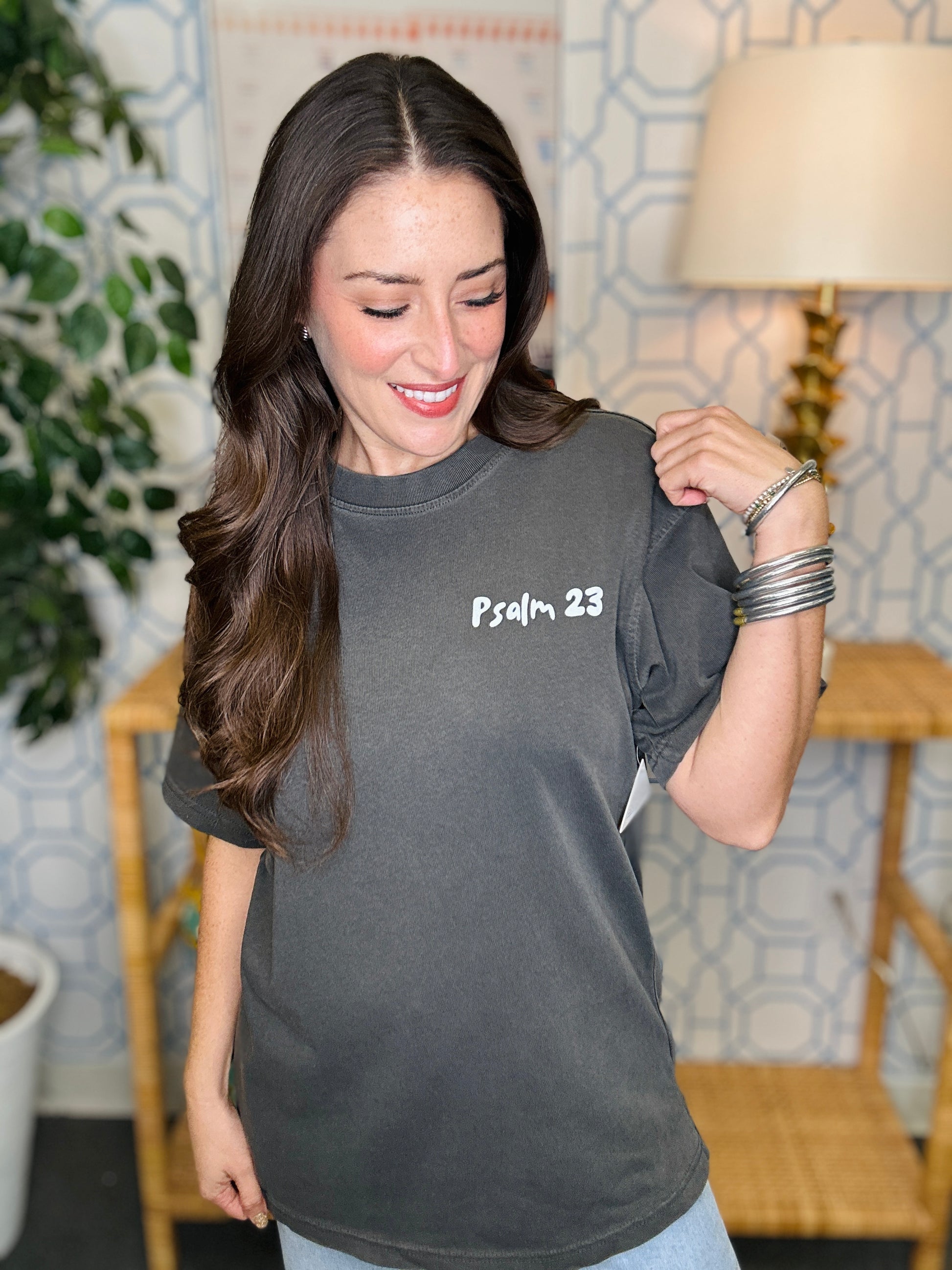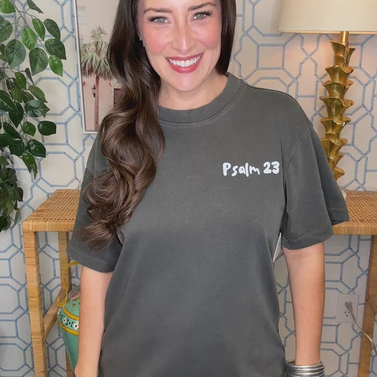 Wear your faith with a smile in this charming graphic tee celebrating Psalm 23. Featuring a playful design that brings spiritual comfort to everyday style, this tee is perfect for believers who want to express their devotion with a touch of personality. Soft, comfortable, and conversation-starting—it's the kind of shirt that shares your heart while keeping you cozy. Whether you're heading to church, running errands, or just living out your values, this tee reminds you (and everyone around you) that the Lord is your shepherd.