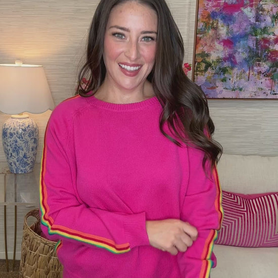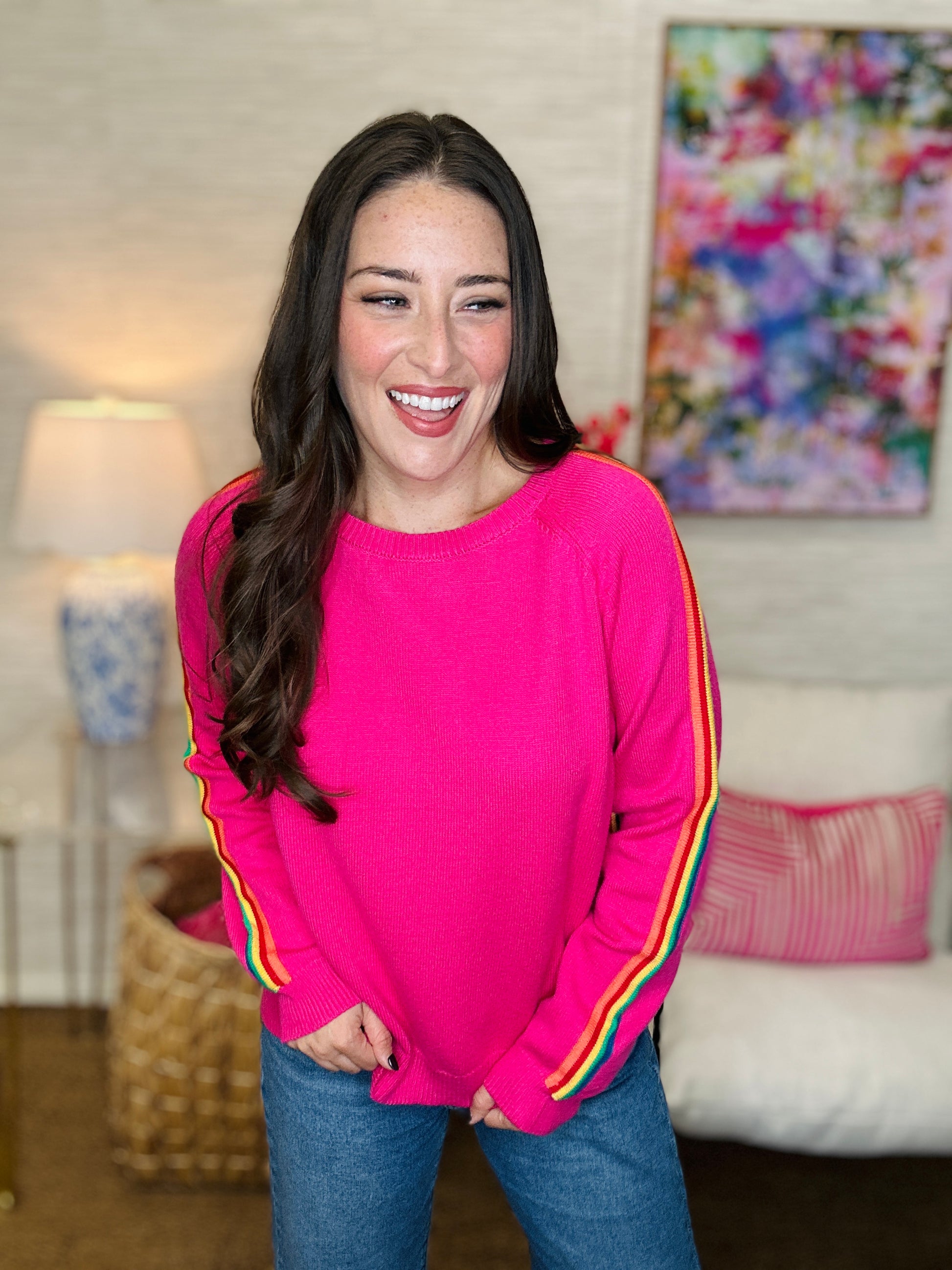 Brighten your day with The Lucky Me Sweater—a hot pink long sleeve crew neck featuring bold rainbow stripes down both arms. This playful sweater brings vibrant color and cozy comfort to any casual look, making every outfit feel lucky and fun!