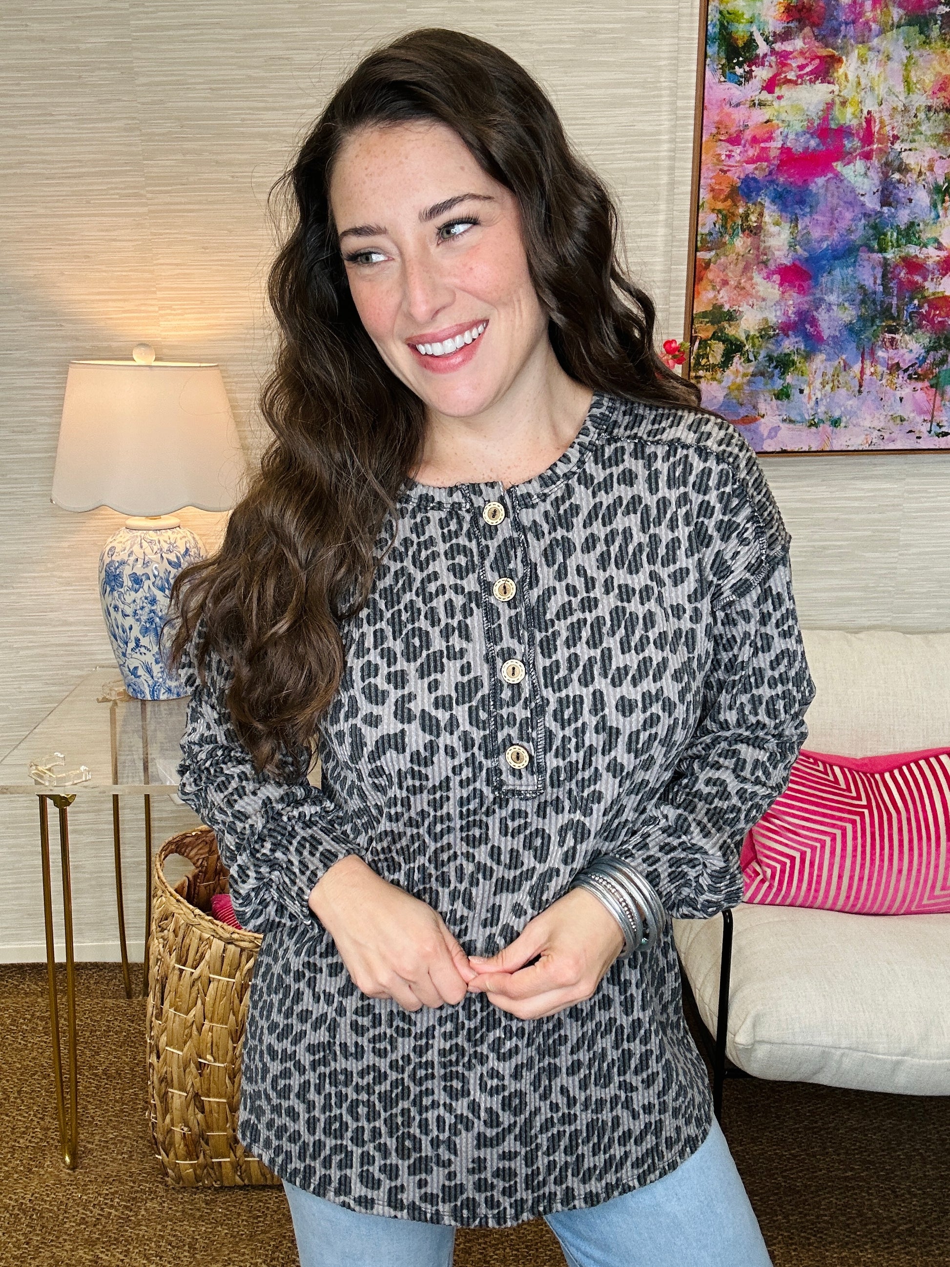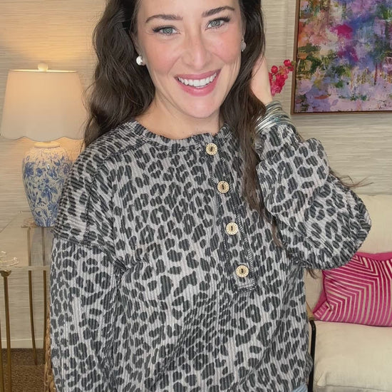 Embrace your wild side with The Lush Leo Top—a cozy essential with serious style credentials. Crafted from soft, waffle-textured fabric that feels as good as it looks, this top features a bold Leo print and a charming four-button front closure. Perfect for layering or wearing solo, it's the kind of piece that makes getting dressed fun. Comfort meets confidence in this playful wardrobe must-have.