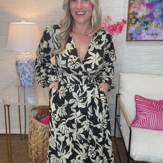 Step into effortless elegance with The Marlowe Maxi, a stunning black wrap dress adorned with bold cream floral designs. Its flattering silhouette and playful pattern make it perfect for turning heads at any occasion while keeping you comfortable all day long.