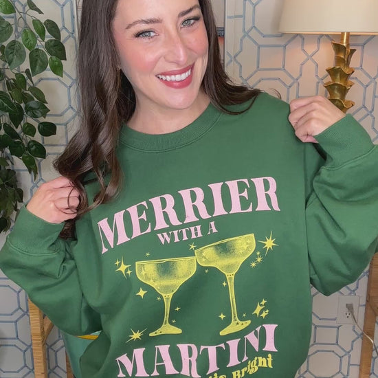Cheers to cozy vibes! The Merrier Martini Sweatshirt brings fun and flair to your everyday rotation with its adorable martini glass graphic. Perfect for girls' nights, casual hangouts, or whenever you want to add a playful touch to your look, this sweatshirt is soft, comfortable, and totally conversation-starting. Pair it with your favorite bottoms and get ready to turn heads while staying snug and stylish. Sip on the good life in this must-have piece!