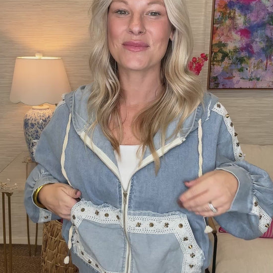 The Natural Gauze Hoodie in Denim combines comfort and style with its regular fit and playful balloon sleeves. Made from soft double gauze, it features handy front pockets, studded trim, and unique outseam details. The back elastic band ensures a snug fit, while vintage washing adds a cool, worn-in vibe perfect for laid-back days.