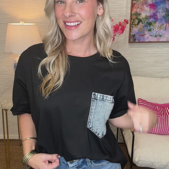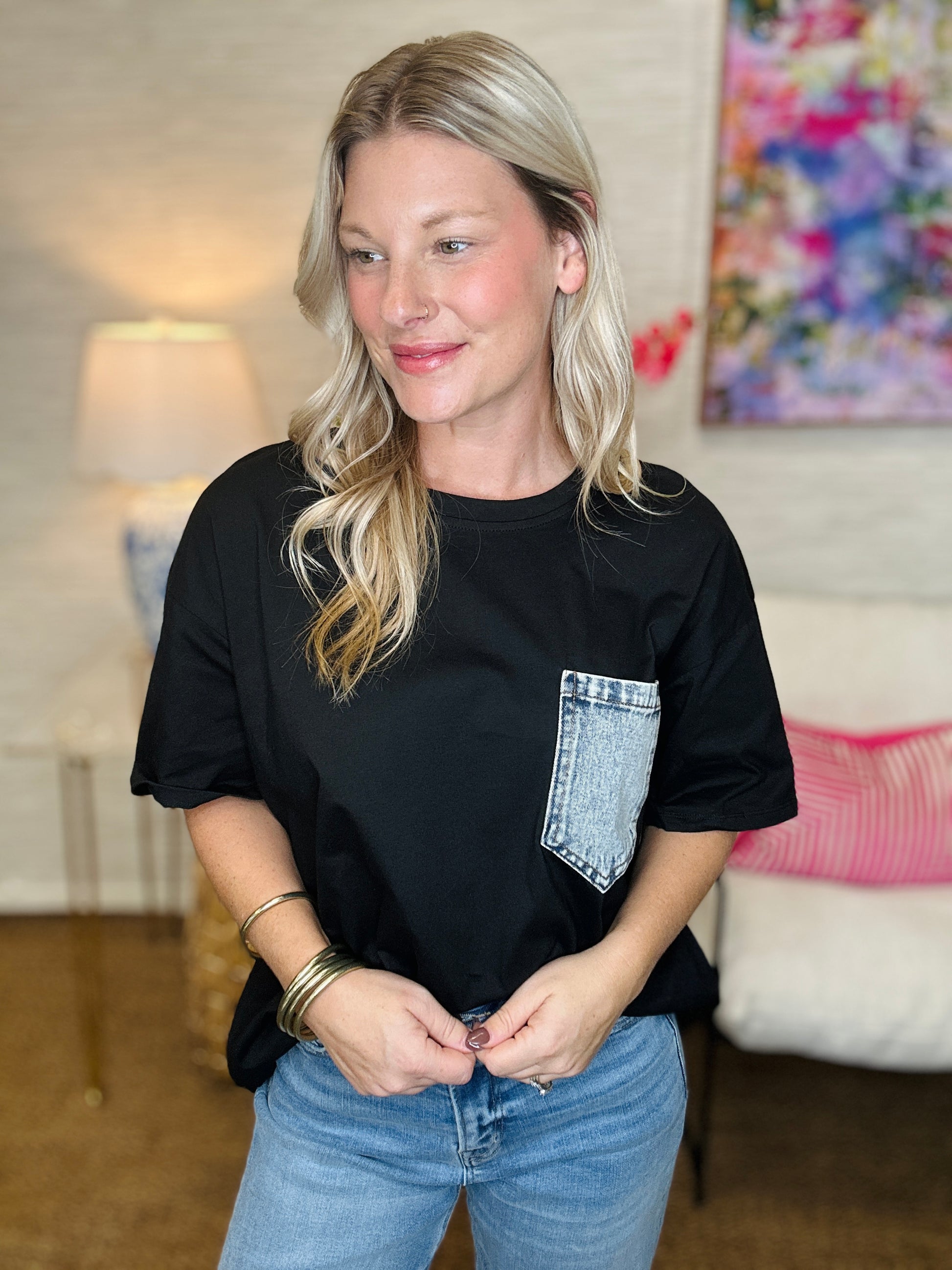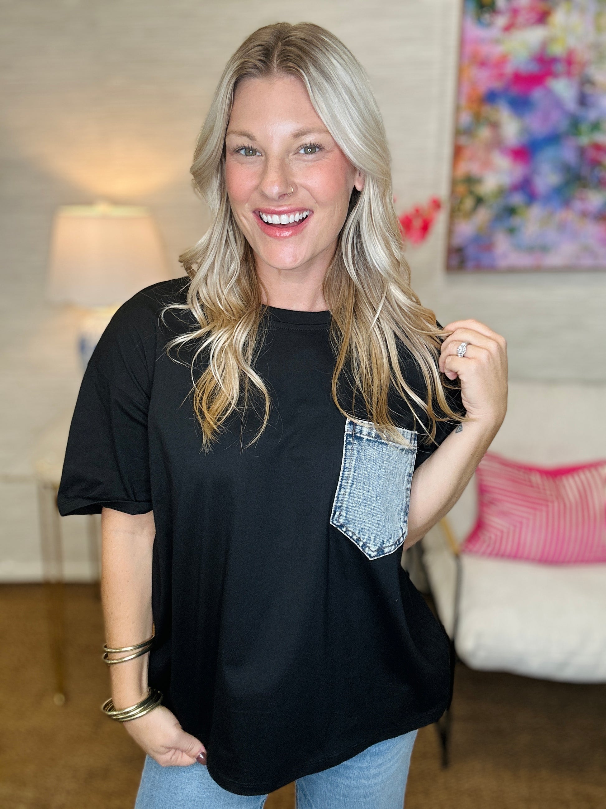 Keep it cool and casual with The NEW Denim Pocket Top. This basic black tee gets a playful upgrade with a quirky denim pocket on the front, adding just the right amount of edge to your everyday look. Perfect for layering or wearing solo, it’s a fun way to mix classic comfort