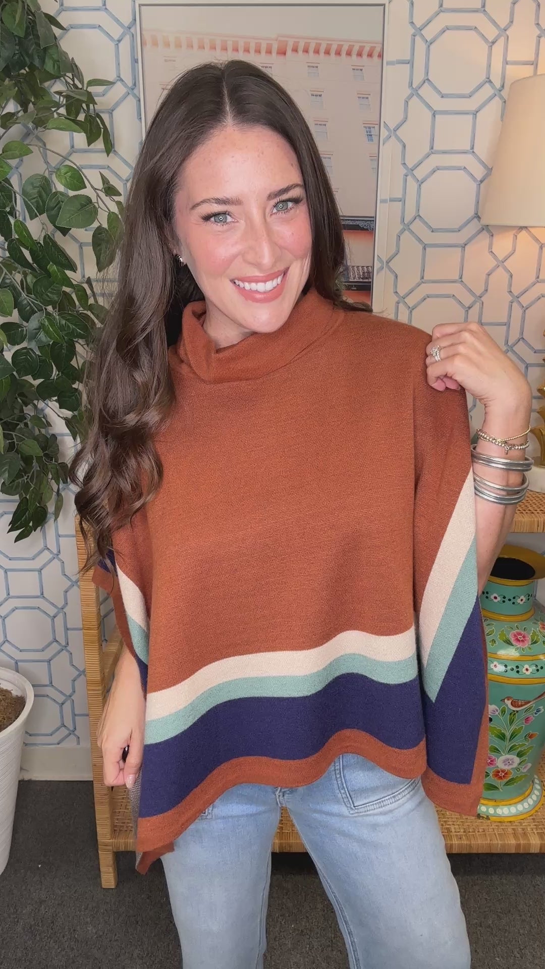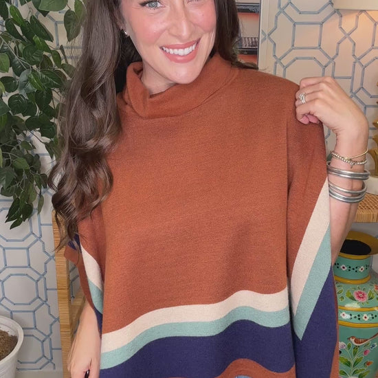 The Nina Poncho is your ticket to effortless elegance this season. This loose-fitting turtleneck poncho features stunning fall color blocks that celebrate the beauty of the changing leaves. Drape it over your shoulders for instant sophistication, or wear it as a cozy layer that moves with you. The relaxed silhouette and rich seasonal hues make it perfect for everything from coffee runs to evening gatherings. Simple, chic, and undeniably on-trend—this poncho is fall fashion made easy.