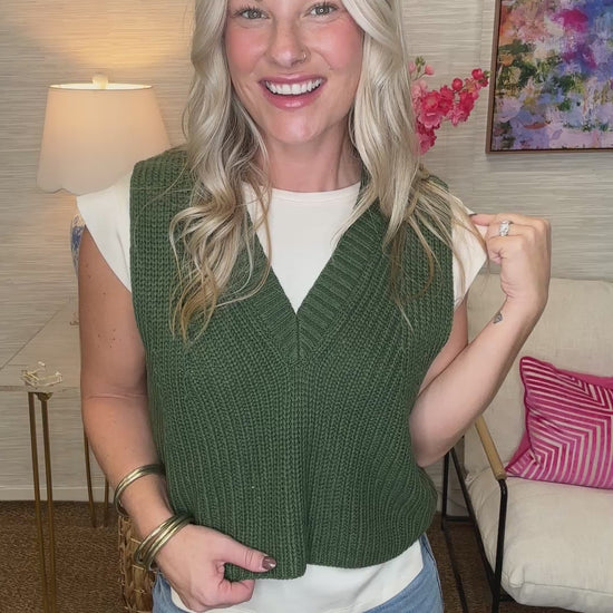 The Brick Vest Sweater is a clever two-in-one that combines a cozy olive-colored V-neck sweater vest with an attached white capped sleeve tee. It’s an easy, playful way to layer without the fuss—perfect for adding a stylish twist to your everyday look.