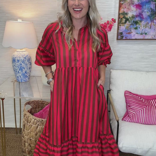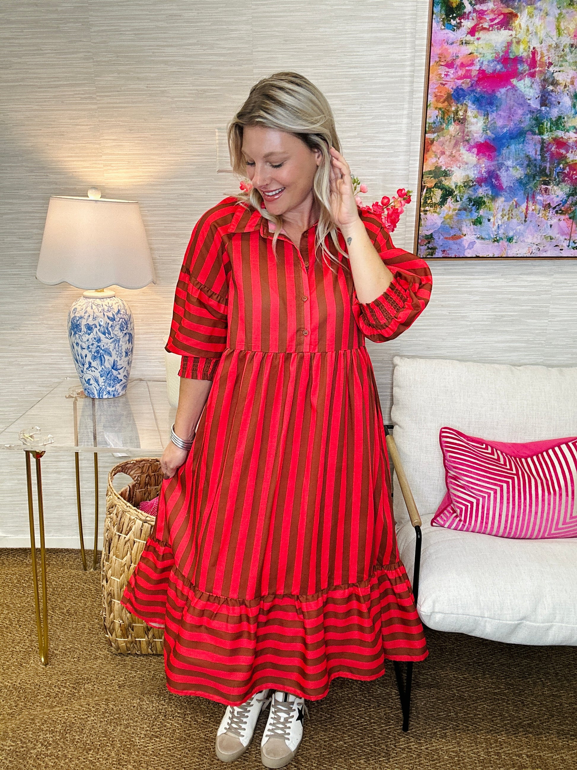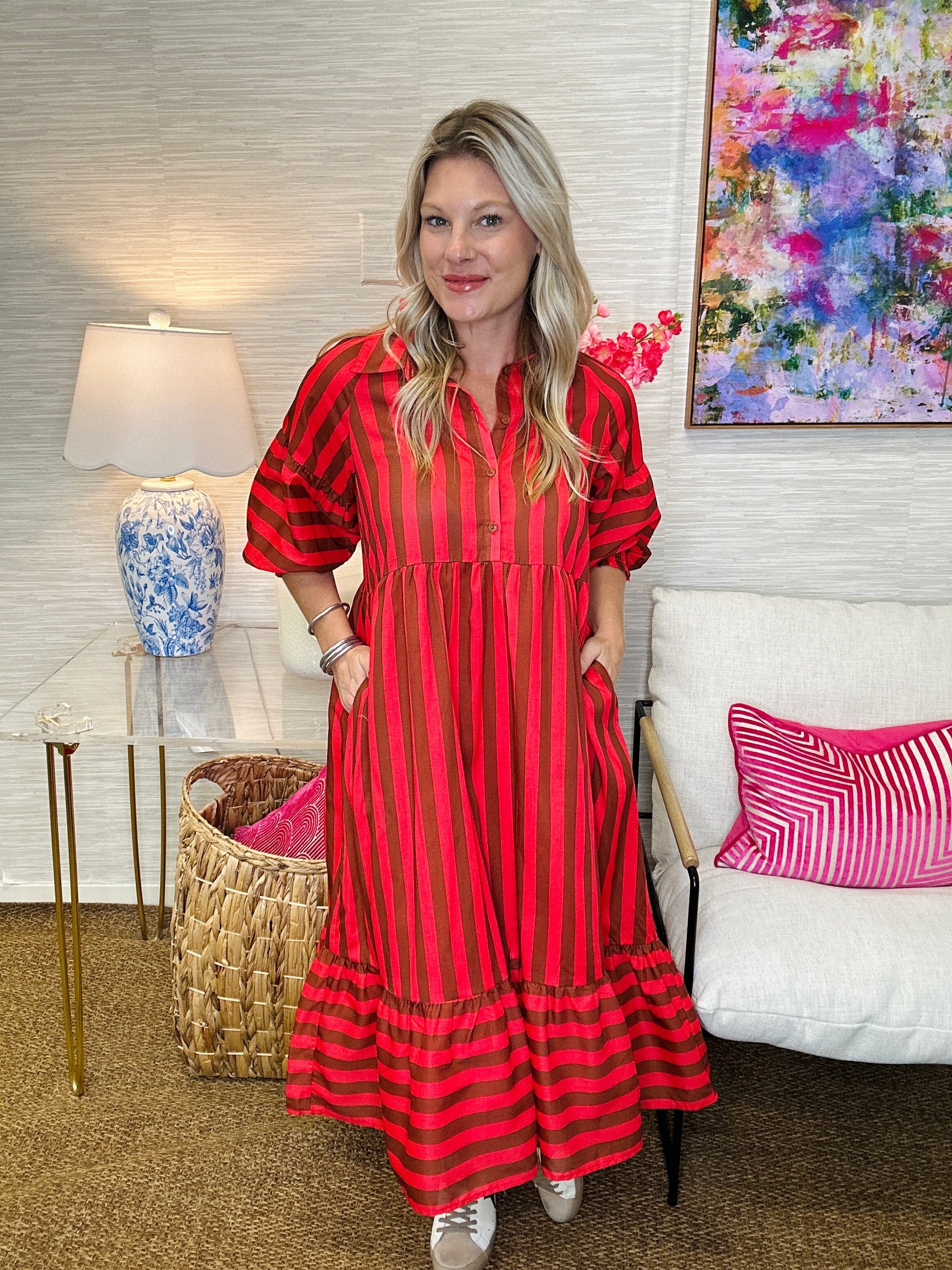 Step into effortless charm with The Owner Midi. This stripe print button-down midi shirt dress offers a playful twist on classic style, perfect for sunny days or casual outings. Its flattering silhouette and easy-to-wear design make it a go-to for fun, flirty fashion that moves with you.