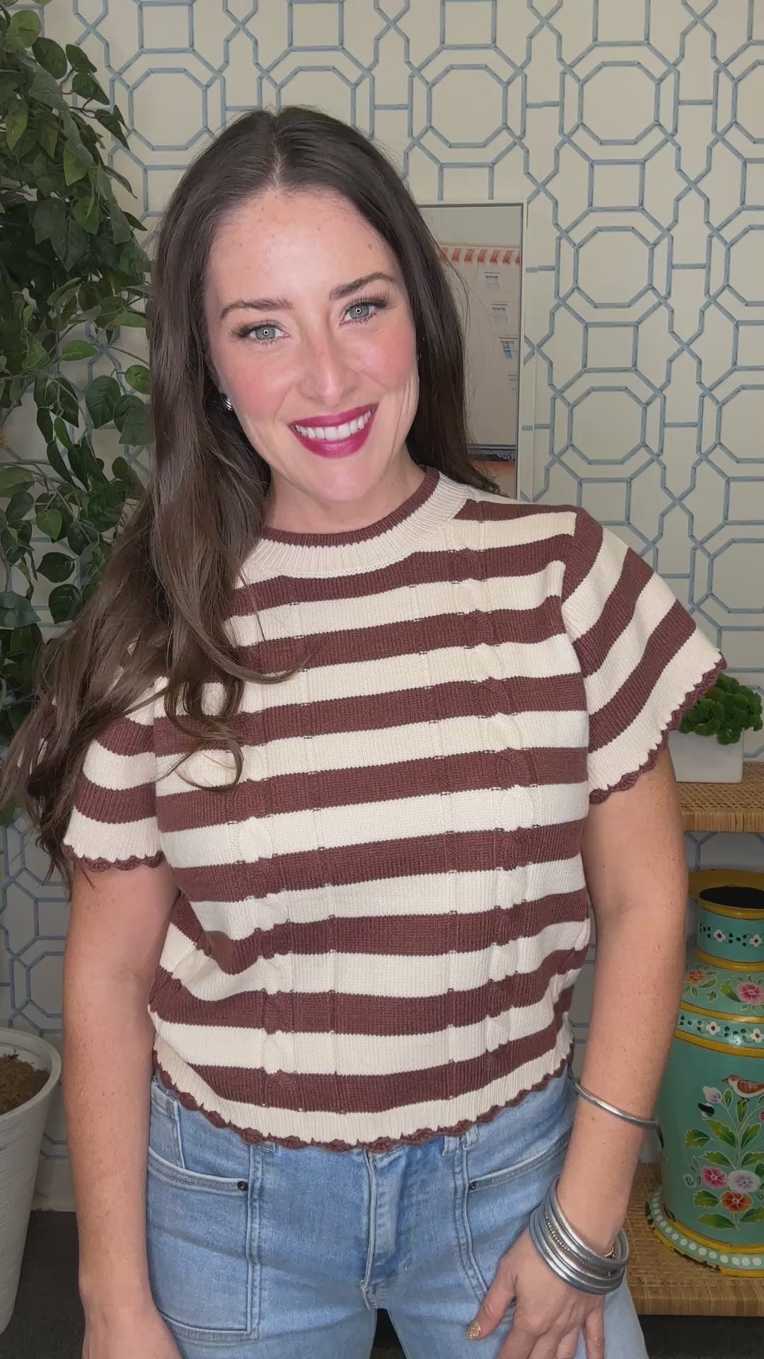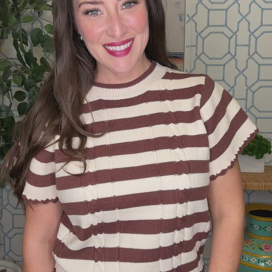 The Pep Top brings playful energy with its brown and white stripes and flirty short flare sleeves. This knit sweater adds a fun land flirty look to your wardrobe.