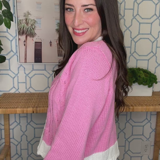 Wrap yourself in cozy elegance with this cable knit cardigan that's giving preppy-meets-playful vibes. Soft pink pairs perfectly with crisp white trim for a fresh, polished look, while those gorgeous metal flower buttons add a touch of whimsy that elevates the whole vibe. Whether you're layering over your favorite tee or throwing it on for instant sophistication, this cardigan is your new wardrobe MVP that works as hard as you do.