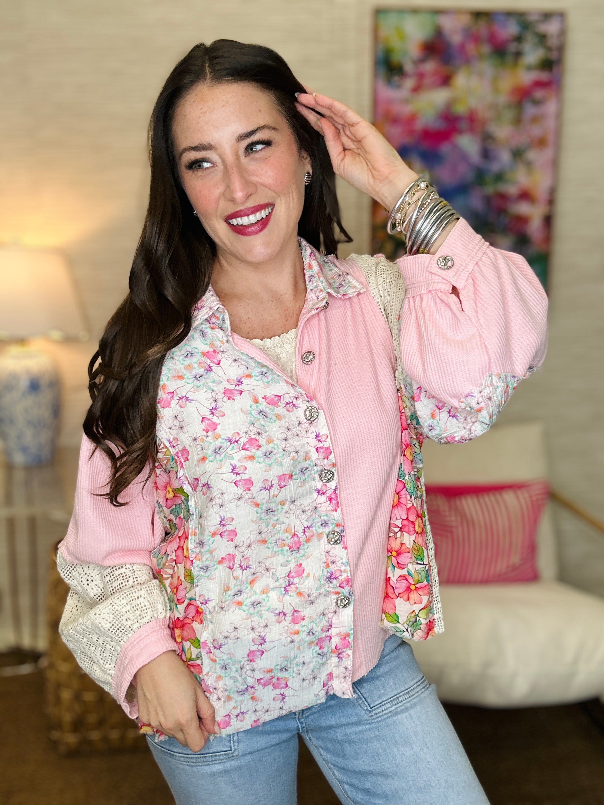 Layer on the fun with this playful button-up that mixes denim, patchwork, and delicate lace for an effortlessly eclectic vibe. Each panel tells its own story—classic denim meets whimsical patchwork blocks and romantic lace accents that peek through for unexpected charm. Perfect for those who love mixing textures and aren't afraid to stand out. Dress it up or down, this top brings personality to any outfit.