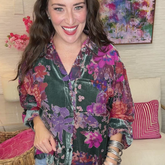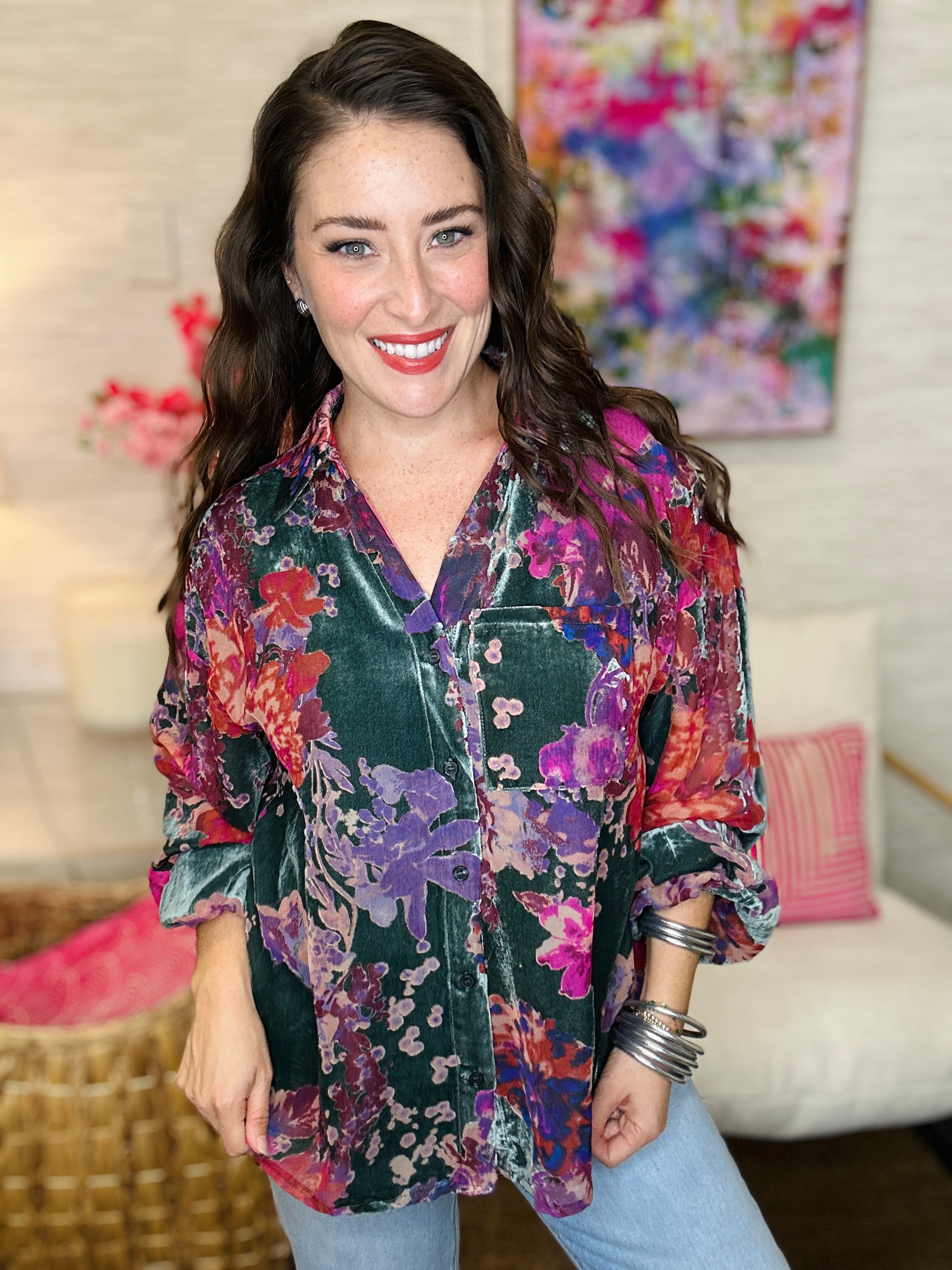 The Pruitt Top is a playful take on classic elegance with its rich velvet look and charming floral details. The button-up style adds polished flair while keeping things fun and flirty for any occasion.