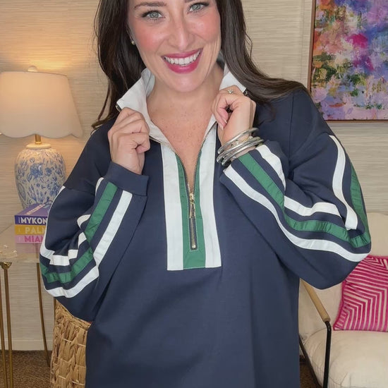 This is a rugby-inspired classic with a playful twist! This half-zip pullover features crisp white and green stripe detailing running down the sleeves and front, giving you that preppy-cool aesthetic. The front zipper makes it easy to adjust your comfort level, whether you're layering up or cooling down.