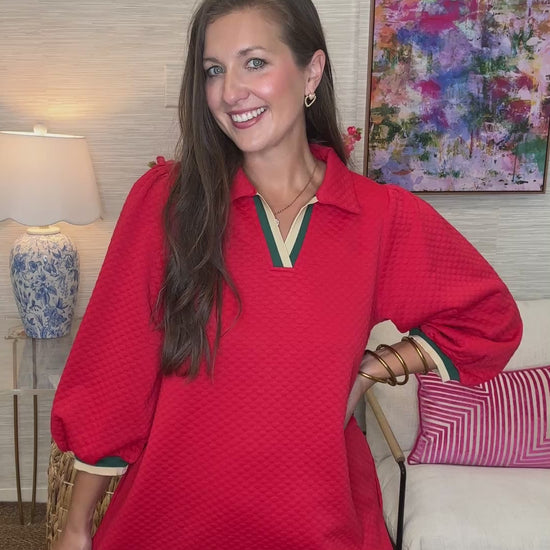 Turn heads in The Raceway Dress! This fun dress features 3/4 inch balloon sleeves and a flattering V-neck trimmed with bold pops of color on the neckline and cuffs. Its quilted fabric with subtle dot details adds a playful texture, making it perfect for standing out with cozy charm.