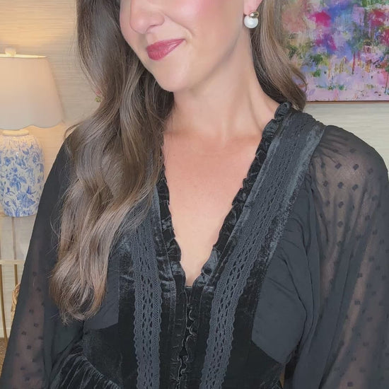 Introducing The Reverie Dress—elegance with a playful twist! This romantic black velvet number features a flattering V-neckline that's both sophisticated and sultry. Long sheer sleeves provide that luxe feel while delicate lace trim details add whimsical charm throughout. The sumptuous velvet fabric drapes beautifully, creating an effortlessly chic silhouette perfect for date nights, special occasions, or whenever you want to feel absolutely enchanting. It's the dress that whispers "I've got style" without saying a word. Velvet dreams and lace details—what's not to love?