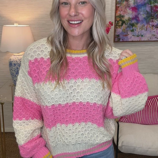Say hello to The Rigsby Sweater—a playful twist on classic stripes! With its pink and white stripes, fun balloon sleeves, and unexpected pop of orange at the neckline and cuffs, this cozy sweater brings cheerful style and a dash of surprise to your day. Perfect for making every outfit a little brighter!