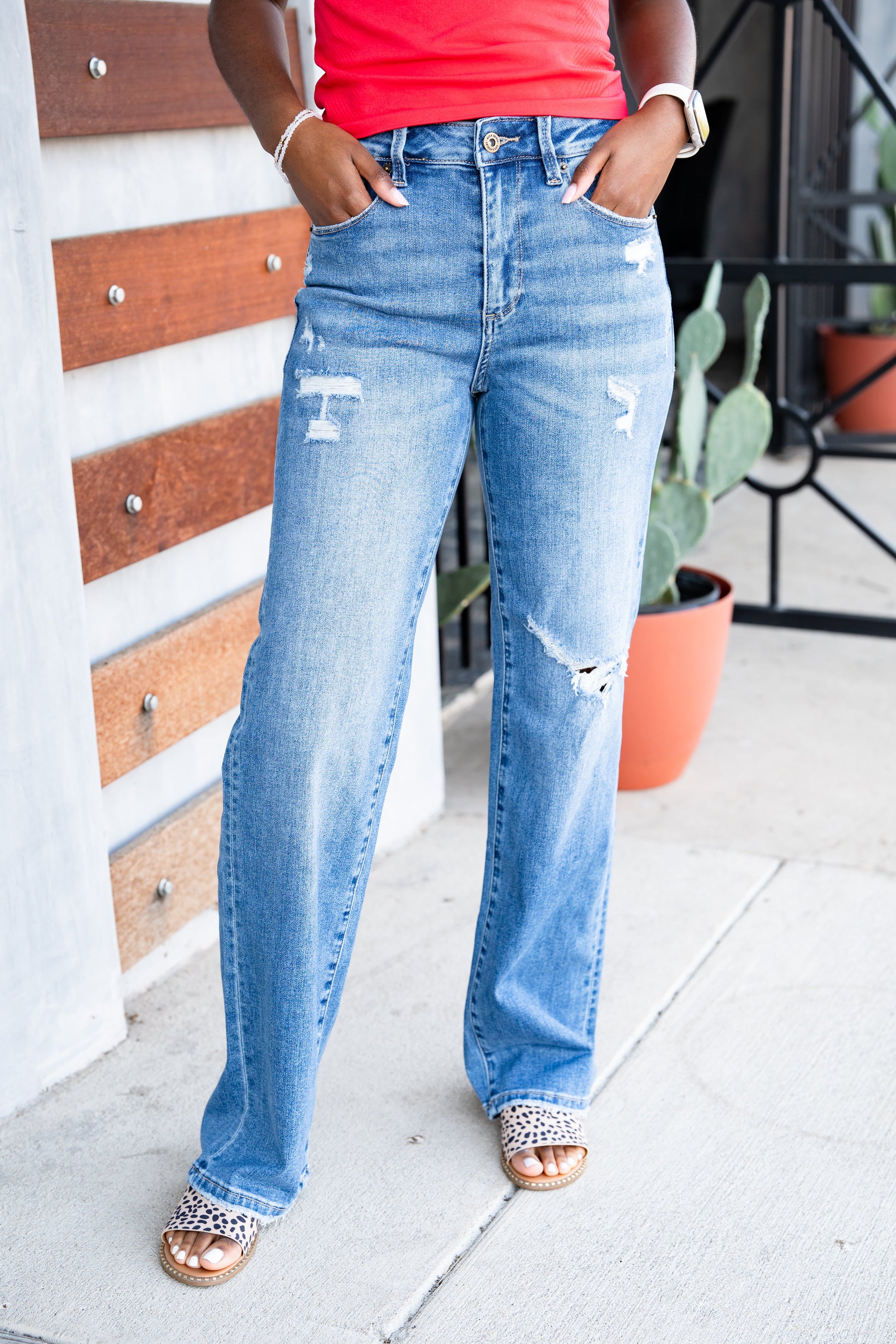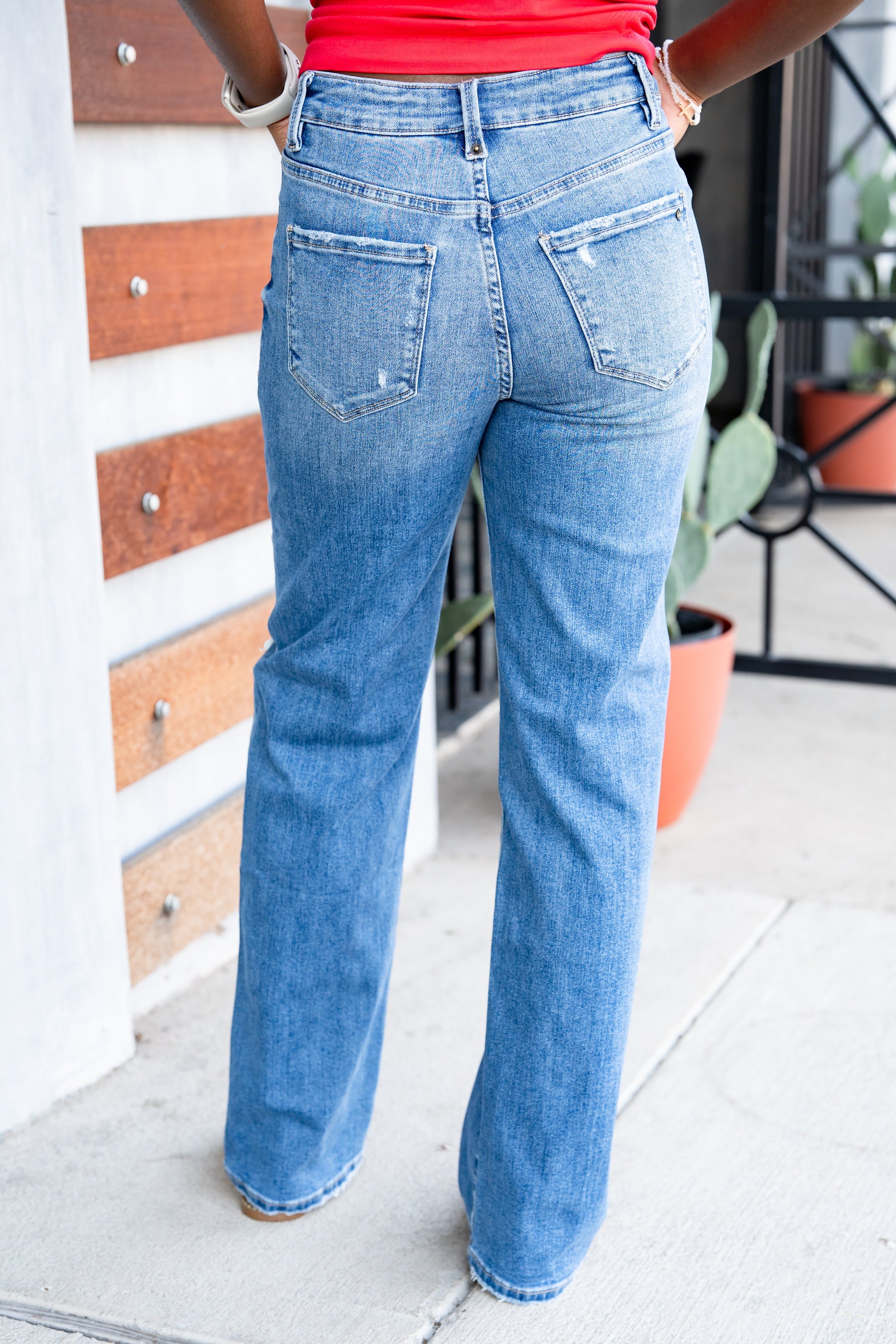 These Mica Straight-Leg Jeans in a medium wash offer the perfect balance of effortless style and versatility. Featuring slight distressing for a touch of edge, their classic straight-leg fit flatters every silhouette. Dress them up with heels for a chic, polished look or keep it casual with sneakers—either way, they’re a must-have for any wardrobe!