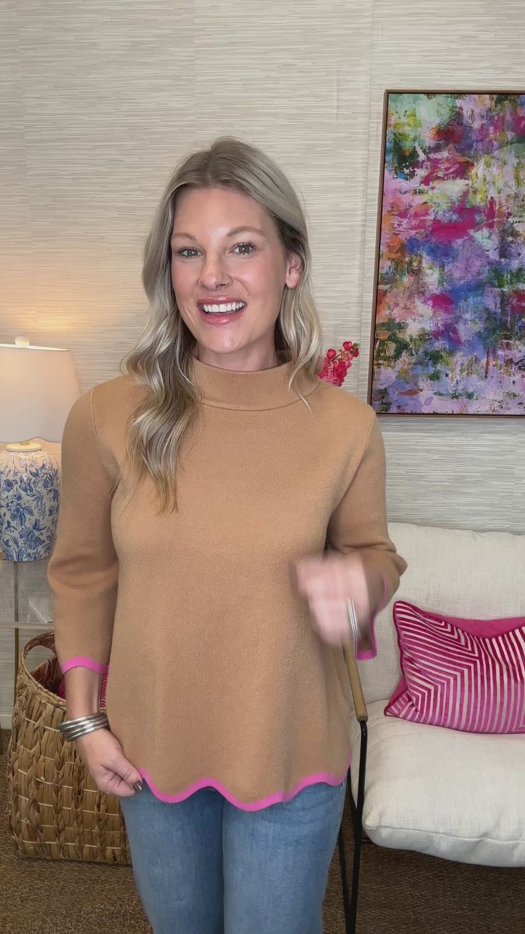 Brighten your look with The Scallop Edge Sweater! This playful mock neck top charms with delicate scalloped edges that add a touch of whimsy to your outfit. Soft and stylish, it’s perfect for layering or wearing solo when you want a cozy pop of fun.