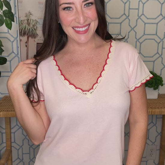 Flirty and feminine, this short sleeve tee features delicate lace trim that adds a touch of elegance to your everyday wardrobe. The scalloped detailing brings a sweet, romantic vibe perfect for dressing up or down. Available in three gorgeous colors, you'll find the perfect shade to match your style. Soft, comfortable, and effortlessly chic—this tee is your new go-to piece for looking put-together without trying too hard.