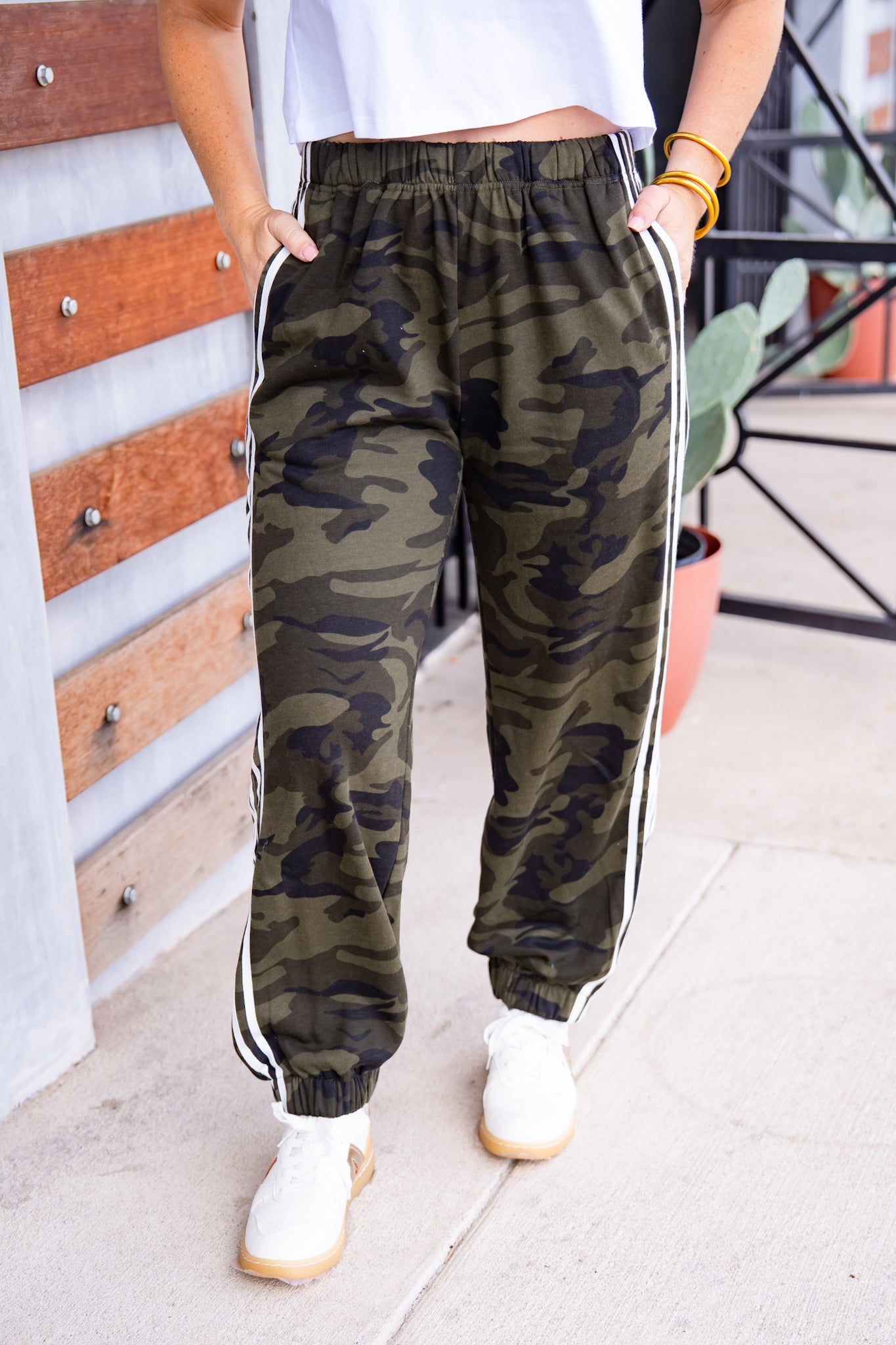Get ready to lounge or step out in style with The Sideline Pants—the comfiest joggers of the season! Featuring a trendy camo print with four bold white stripes down each side, these pants bring sporty flair to a soft, stretchy fit. They feel like your favorite sweats but with a lighter, breathable vibe, perfect for all-day comfort. The super elastic waistband keeps things snug without pinching, making these pants your new go-to for fun, relaxed days.