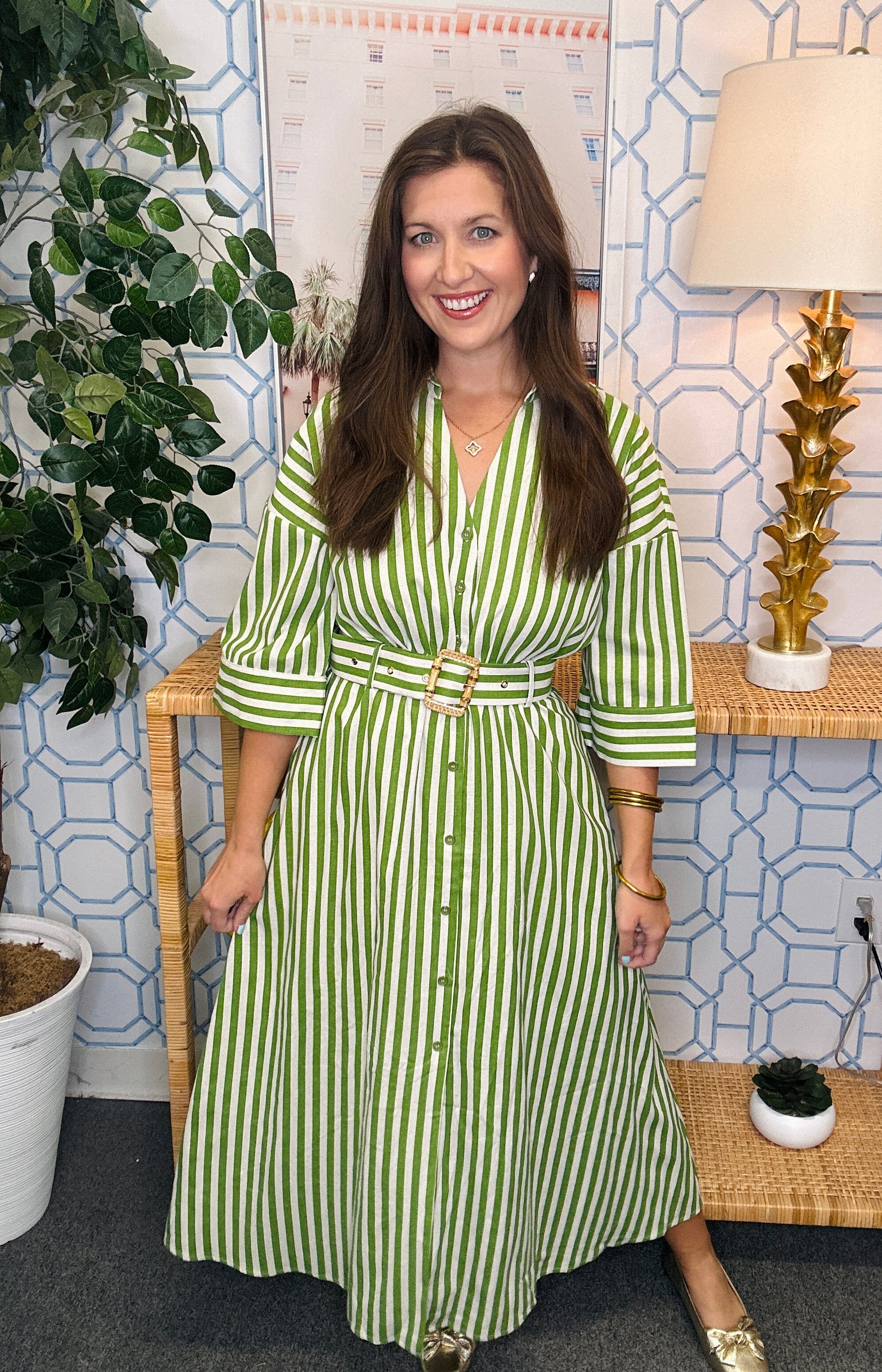 Meet The Simon Belted Midi—your new favorite dress for looking put-together without trying too hard. This striped button-up features a flattering V-neckline and a cinched waist belt that creates the perfect silhouette. The midi length keeps things sophisticated while the playful stripes add personality to your everyday rotation. Slip it on with flats for a relaxed vibe or pair it with heels for an instant upgrade. Available in two gorgeous colors, this versatile piece transitions seamlessly from desk to dinner.