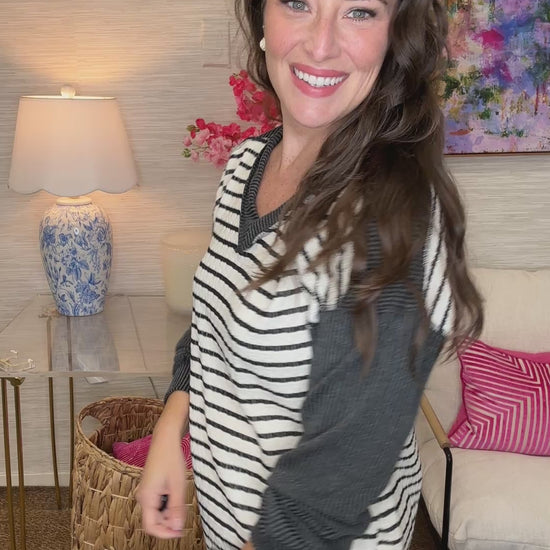 The Solid Sleeves Top strikes the perfect balance between bold and wearable! This loose-fitting v-neck pullover features a striped body that pops with personality, while solid arms keep things grounded and chic. The ribbed fabric adds subtle texture and structure, and the relaxed silhouette means all-day comfort without sacrificing style. Available in four stunning colorways, this top is your new go-to for looking effortlessly put-together!