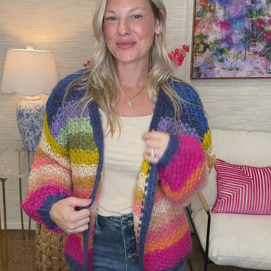 Light up your look with The Starburst Cardigan-AS! This playful handmade cardigan features vibrant multi-color lantern sleeves and a large gauge knit for cozy charm. It's the perfect statement piece to add a burst of fun and warmth to any outfit.