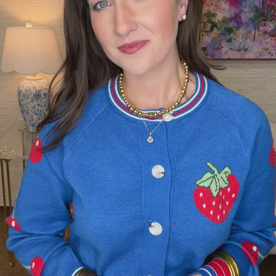 The cutest viscose cardigan featuring a charming strawberry motif in vibrant red on the front, with red cherries adorning the side of sleeves. Layer it over your favorite pieces or wear it solo as a stylish top. The playful fruit details add a whimsical touch to your everyday wardrobe.
