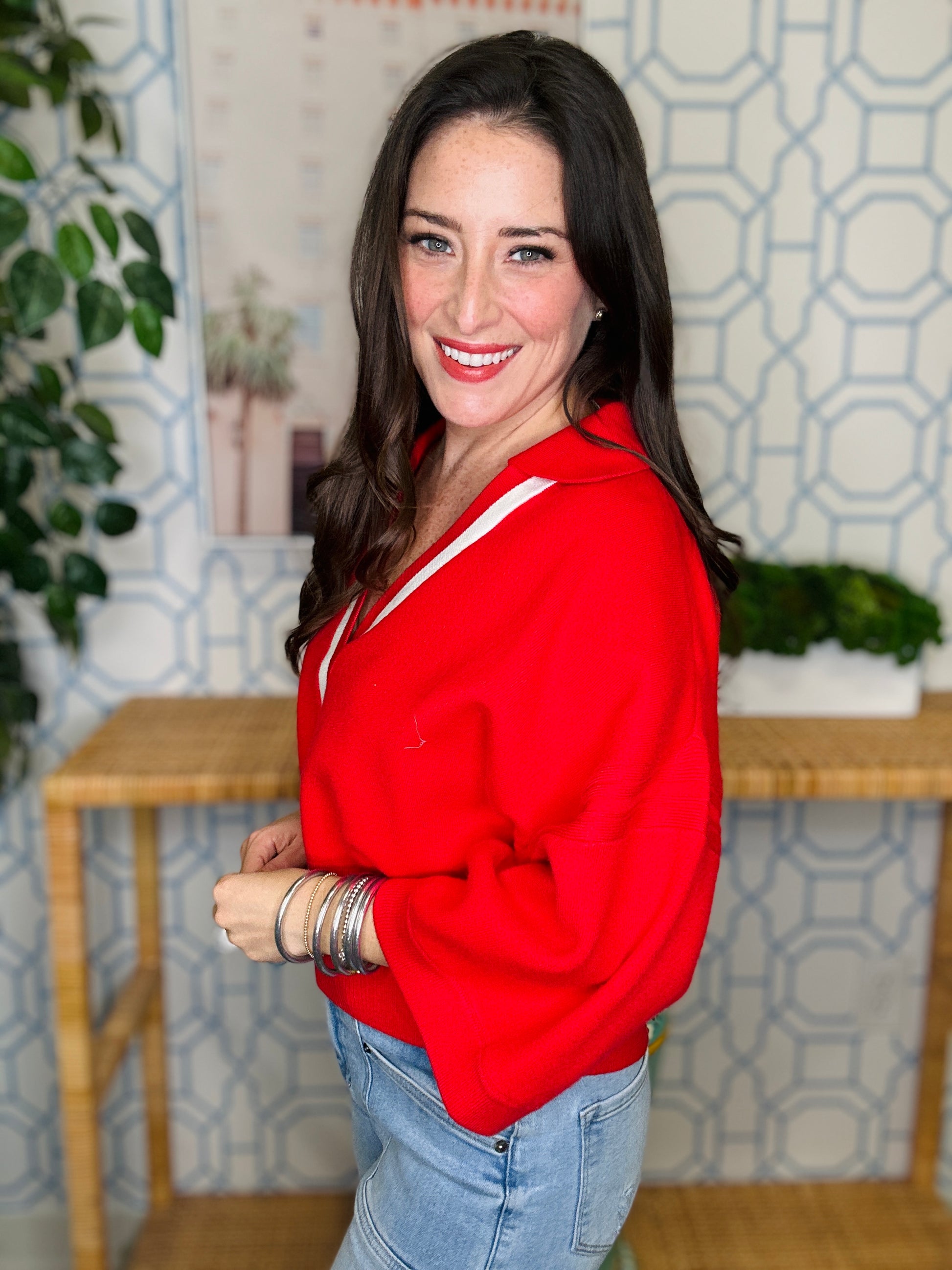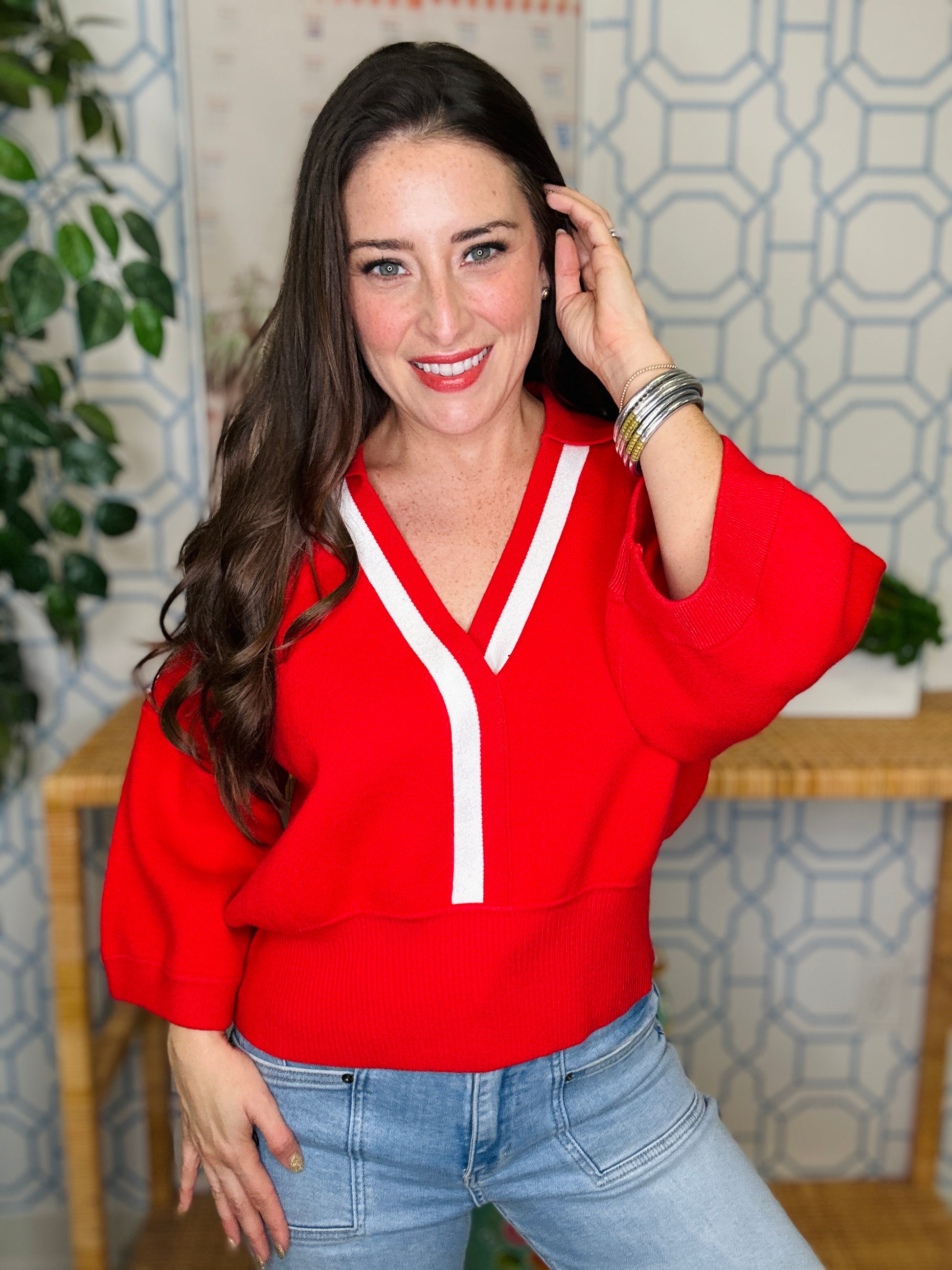 Adorable red top that brings the fun with eye-catching sleeves and a crisp white stripe accent along the neckline. Perfect for adding a pop of personality to your everyday wardrobe. This playful piece pairs effortlessly with your favorite jeans or skirts for a look that's equal parts charming and chic. A must-have for anyone who loves a little whimsy in their closet!