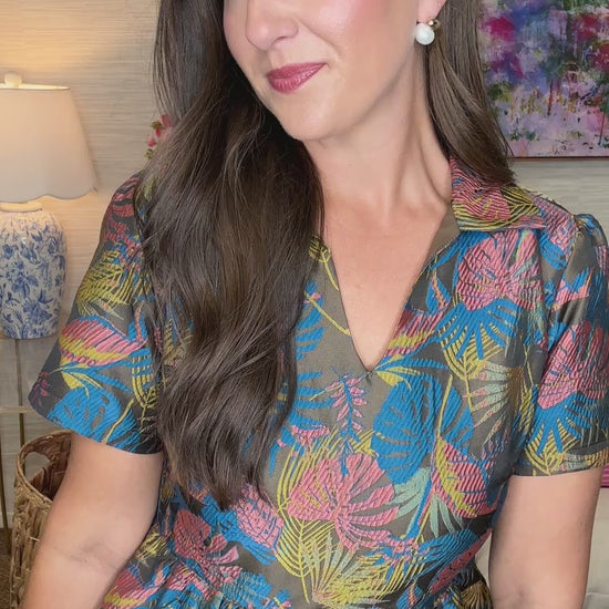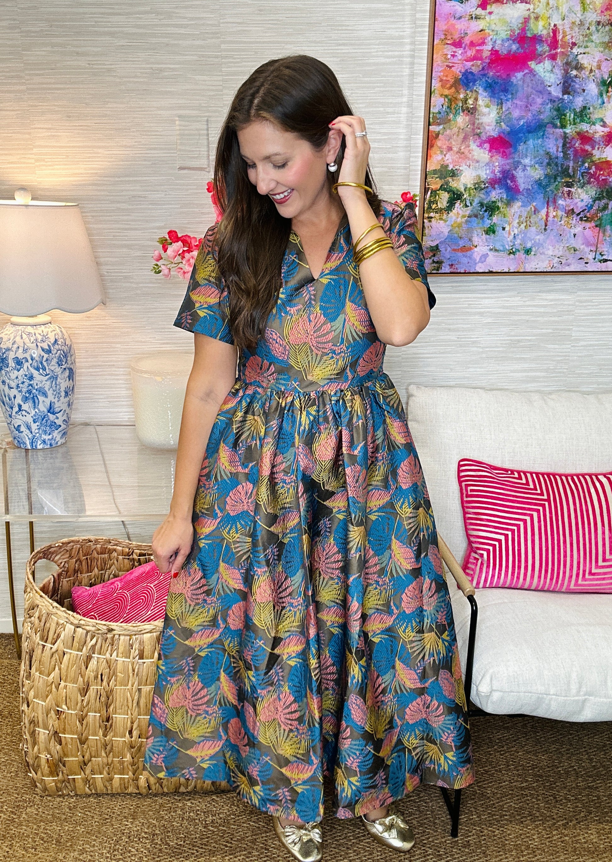 Introducing The Sutton Dress—vintage-inspired charm meets modern comfort! This midi beauty showcases a rich tapestry design. The flattering V-neckline with collar detail adds sophistication and structure. A cinched waist creates a gorgeous silhouette that then gives a slight flare to skirt of dress.