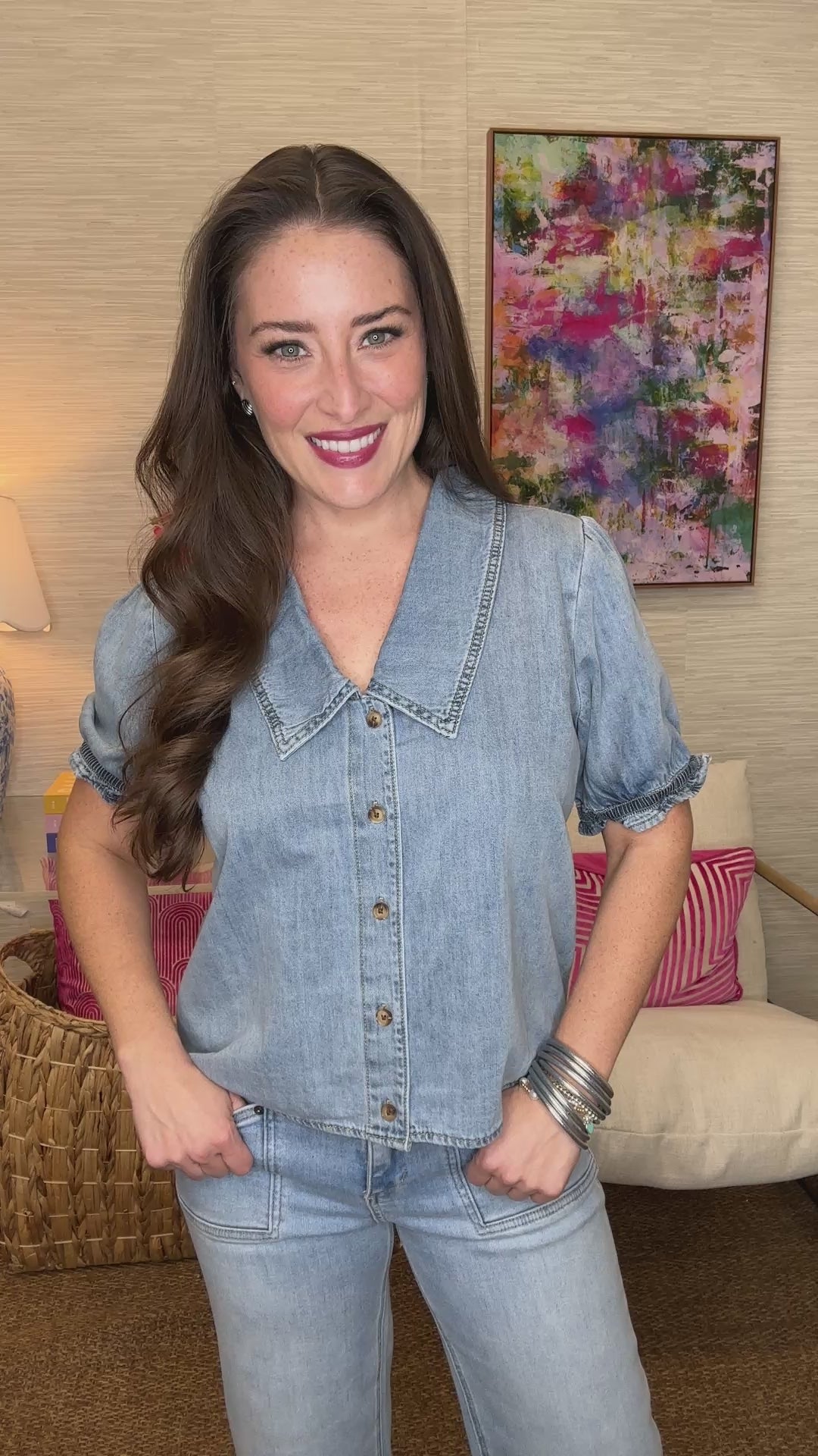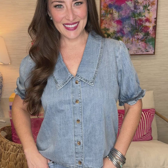 Elevate your denim game with this adorable top featuring a flattering V-neckline and charming bubble sleeves that add a playful twist to a classic fabric. Perfect for casual outings or dressing up with your favorite accessories, this sweet piece brings effortless style and comfort together. The structured bubble sleeves create movement and dimension, while the V-collar offers a universally flattering silhouette. A wardrobe essential that's anything but ordinary.