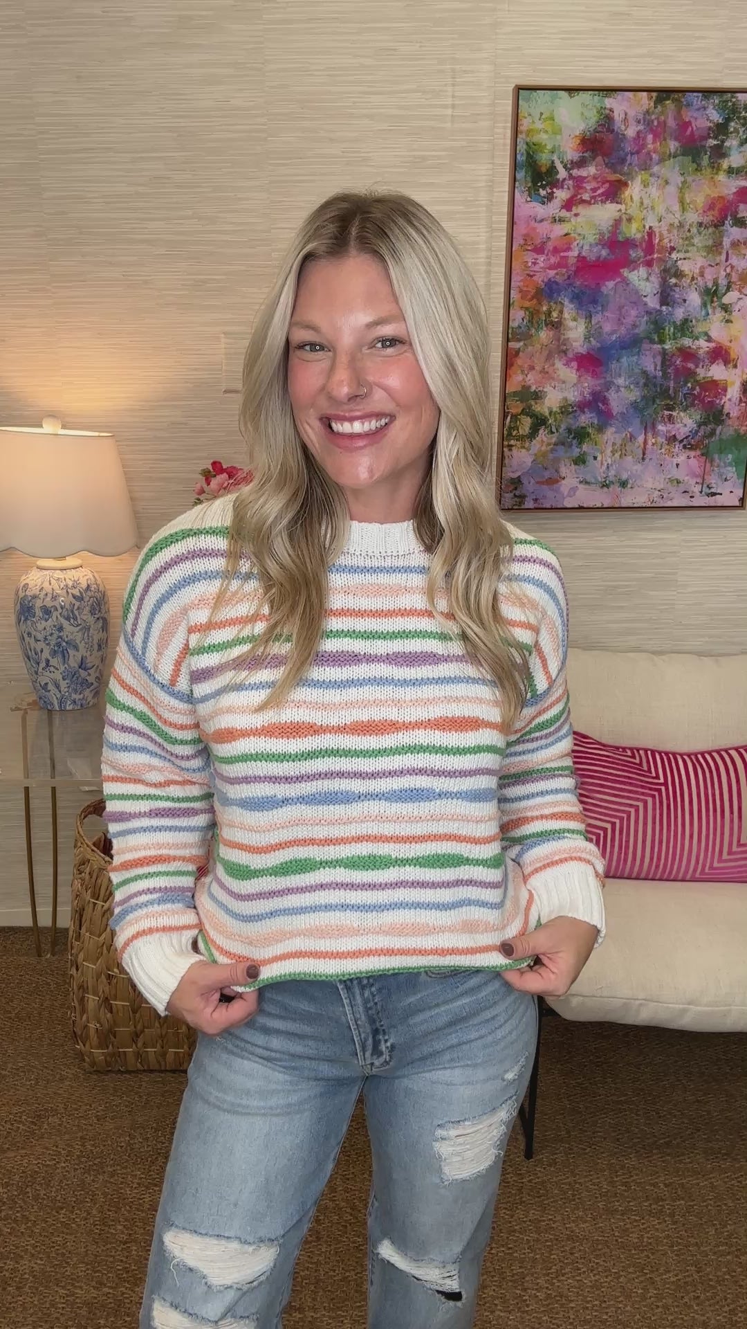 Add a splash of fun to your wardrobe with The Teegen Sweater. Featuring vibrant, textured multi-color stripes and a comfy crew neck, this sweater brings playful energy to any outfit. Cozy up in style and brighten your day with this cheerful, eye-catching piece.