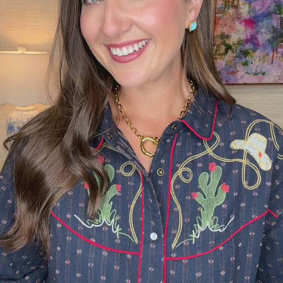 Saddle up in style with The Tenni Top—a cowgirl-inspired button-up that brings Western charm to your wardrobe. This spirited piece features bold red piping that frames the design, while an embroidered cactus adds a fun desert flair. Pair it with the matching cowboy hat and rope accessories for the complete look. Whether you're hitting the rodeo or just channeling your inner cowgirl, this top is ready for adventure with personality to spare.