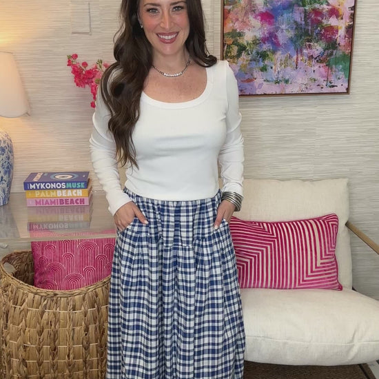 This THML Skirt features a classic blue and white gingham pattern. The timeless checked design pairs beautifully with solid tops and striped pieces, making it a versatile wardrobe staple. Perfect for spring and summer styling, this skirt offers a fresh, preppy aesthetic that never goes out of style. Comfortable and flattering, it's an easy go-to piece for creating multiple outfits throughout your week.