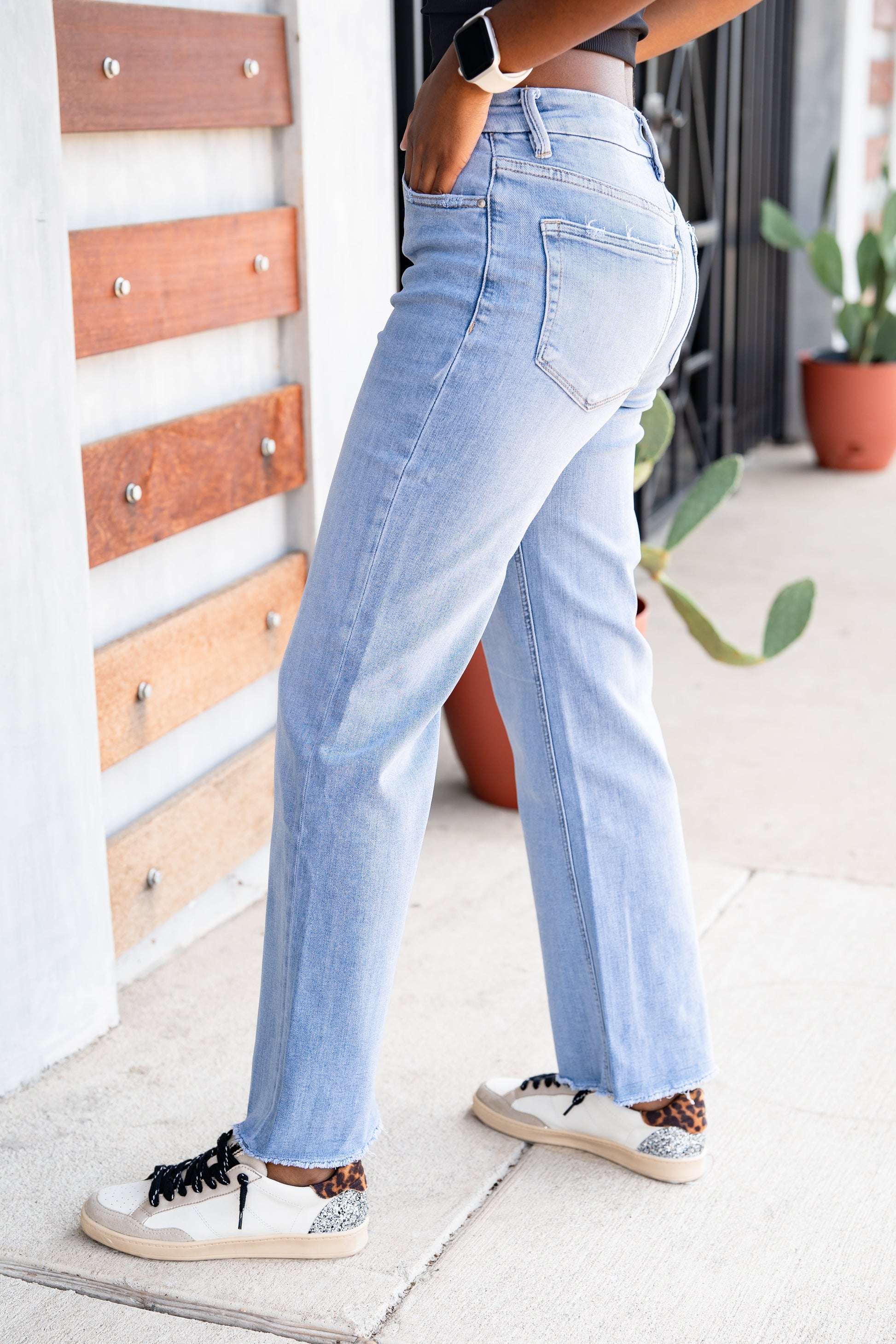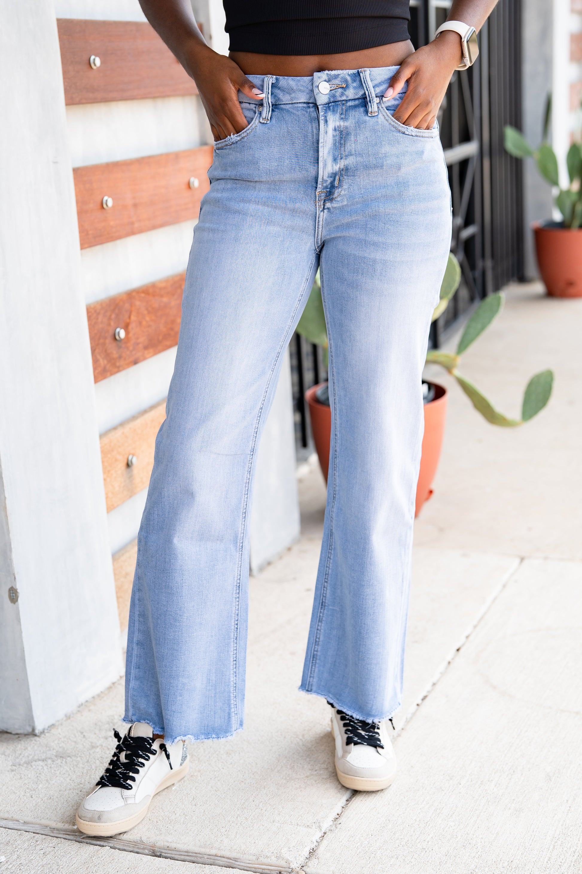 Clean, classic, and effortlessly chic. The Mica Wide Leg Crop Jeans feature a light wash, raw hem, and a flattering wide-leg silhouette for a modern, versatile look. With a non-distressed finish, they’re perfect for dressing up or keeping it casual. A must-have staple for any wardrobe!