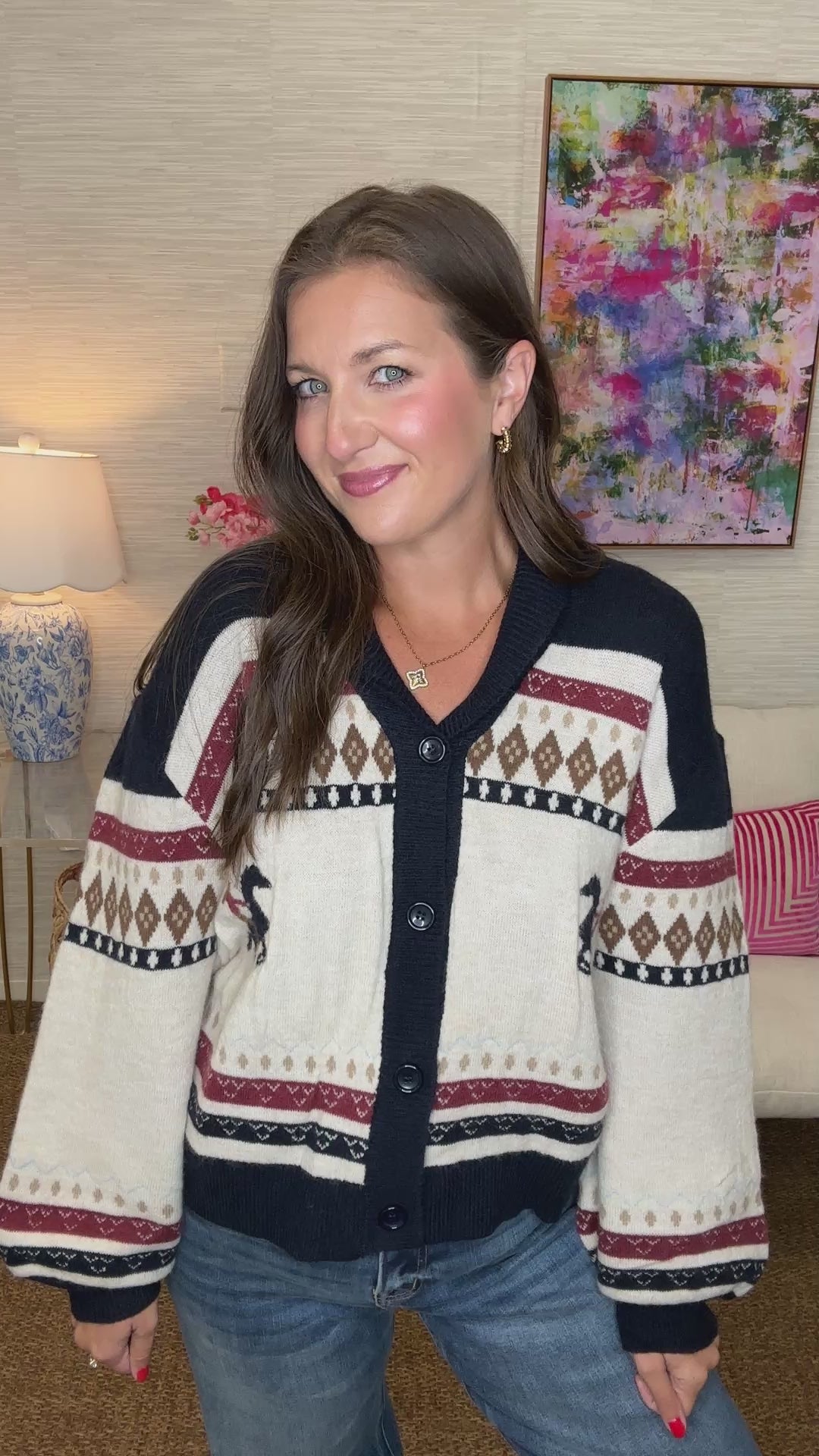 The Vermont Sweater Cardi brings a playful vibe with its oversized fit and charming horse graphic. This button-up cardigan offers cozy comfort while adding a fun, whimsical touch to your everyday look. Perfect for layering with a relaxed, spirited style.