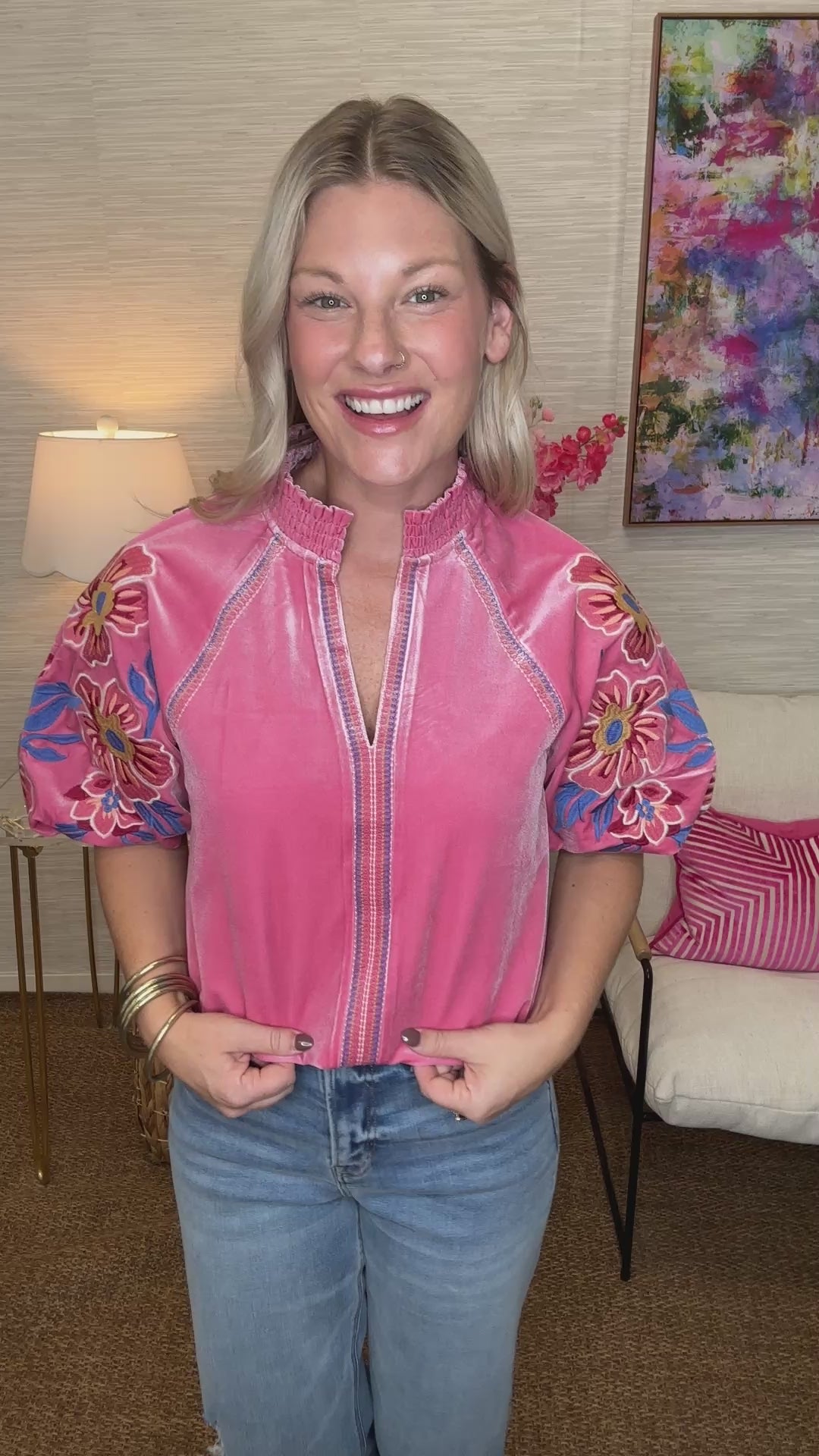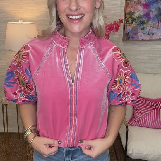 Add a pop of charm to your wardrobe with The Vivienne Velvet Top. Crafted from soft, pink velvet, it features whimsical short balloon sleeves adorned with delicate embroidered flowers. The flattering V-neckline adds a touch of elegance, making it perfect for playful days or cozy evenings.