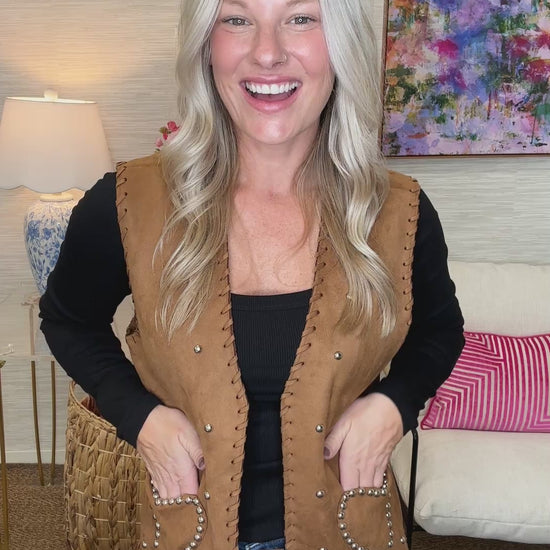 Turn heads with The Whipstitch Vest, featuring fun whipstitch edge details and bold stud embellishments on a suede-like fabric. This playful piece adds a touch of attitude and texture to any outfit, making layering effortless and stylish!