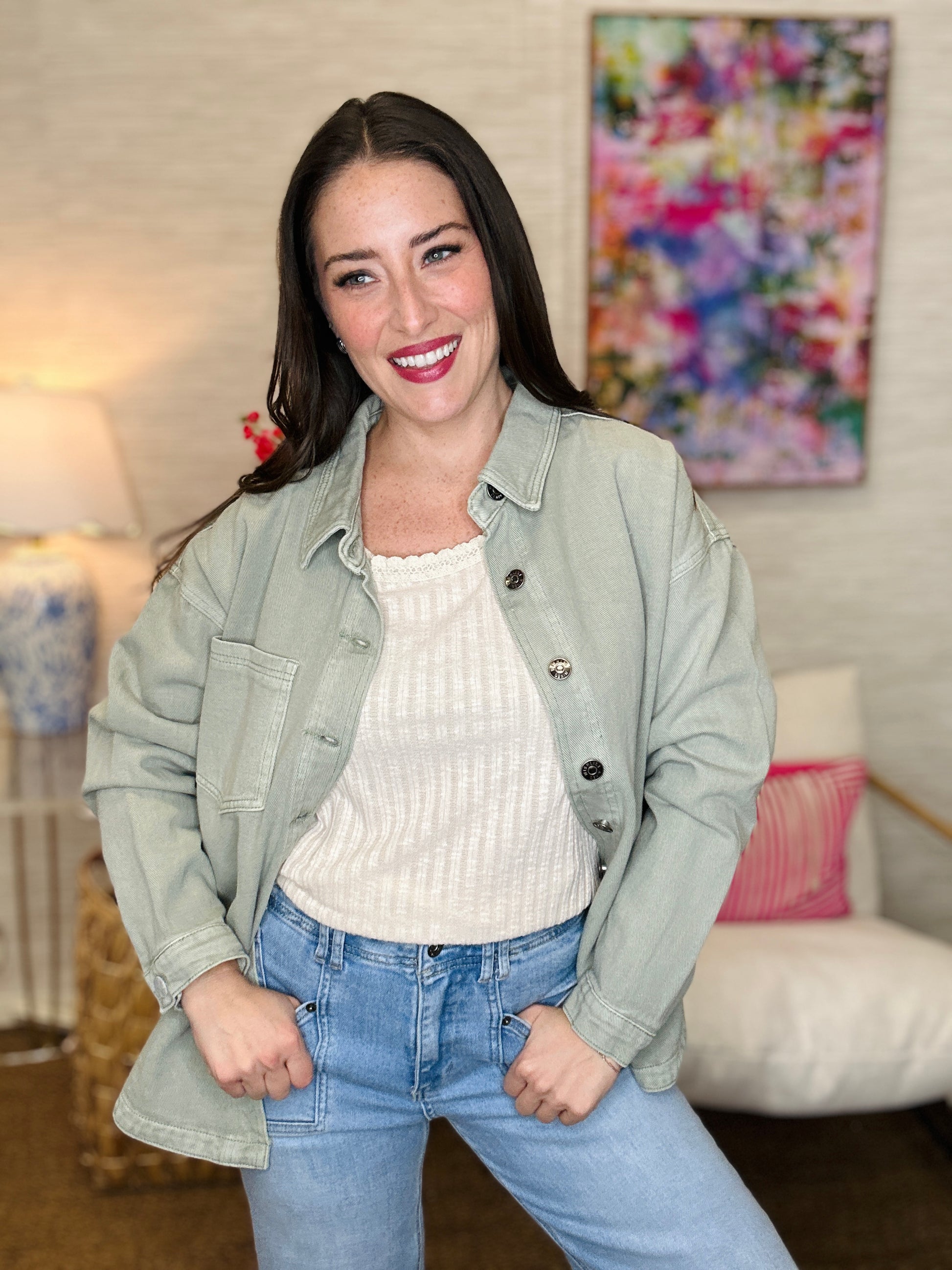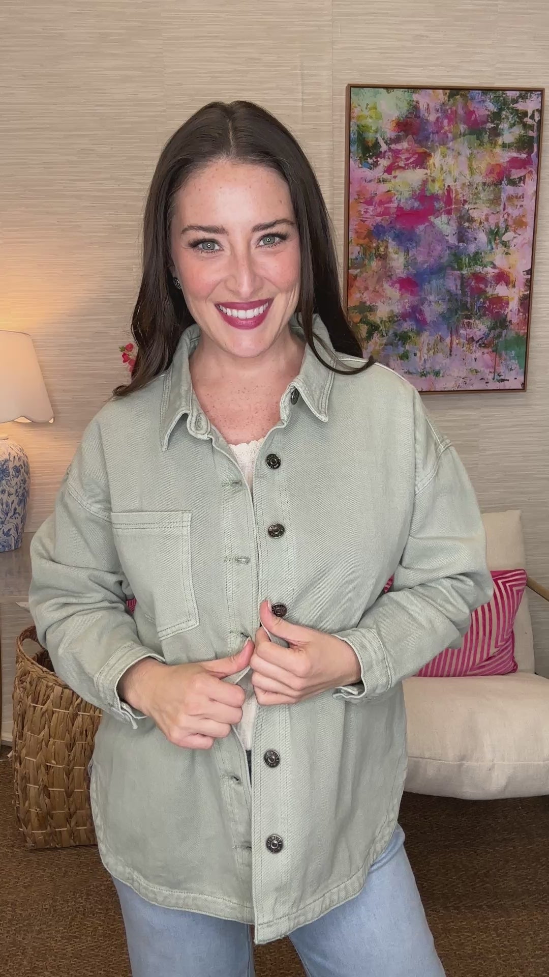 Meet your new favorite layering piece! This sage-colored denim shacket is the perfect blend of shirt and jacket energy—oversized enough to throw over literally anything, but structured enough to wear solo. The soft, muted sage tone pairs with everything in your closet, from graphic tees to sundresses, making it basically a wardrobe MVP. Button it up for a polished vibe, leave it open for effortless cool, or tie it around your waist when things heat up. Durable denim construction means it'll stick around for all your adventures, seasons, and spontaneous road trips. This is the piece you'll reach for again and again.