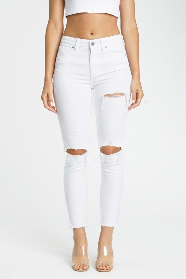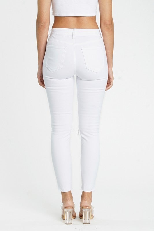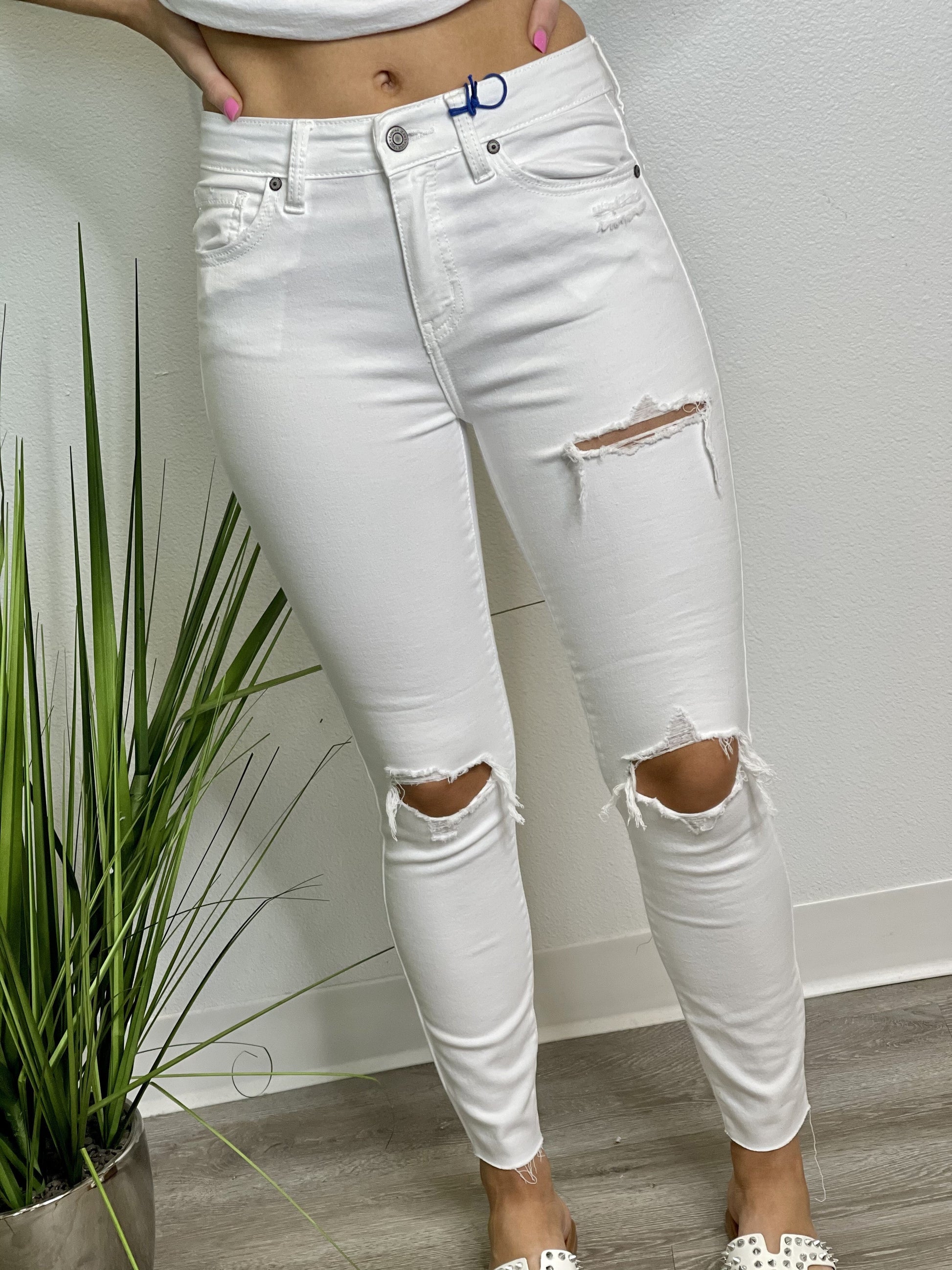 Newest line of jeans to the PDA - Eunina! Crisp white skinny jeans with distressing throughout the front and raw cut hem. Five-pocket design, belt loops and zip fly button closure. Whitney is in her true size 3. Here and ready to ship!
