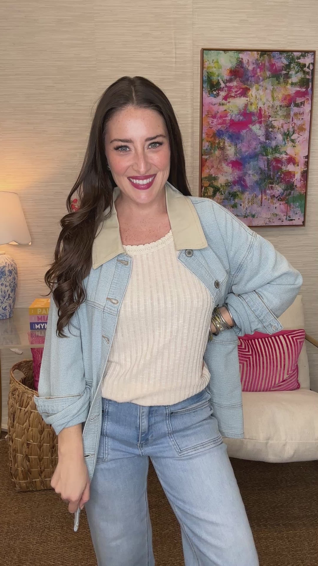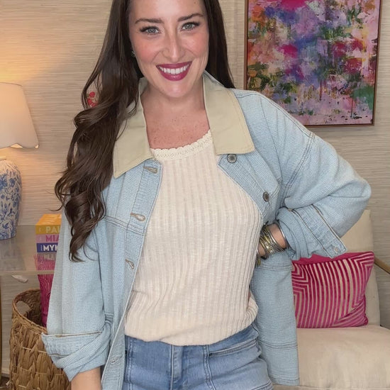 Meet your new wardrobe essential—a light wash denim utility jacket that's equal parts practical and playful. The taupe contrast collar adds a sophisticated twist that elevates any outfit. Packed with functional details and that perfect lived-in denim feel, this jacket transitions seamlessly from casual coffee runs to weekend adventures. Layer it, style it, love it.
